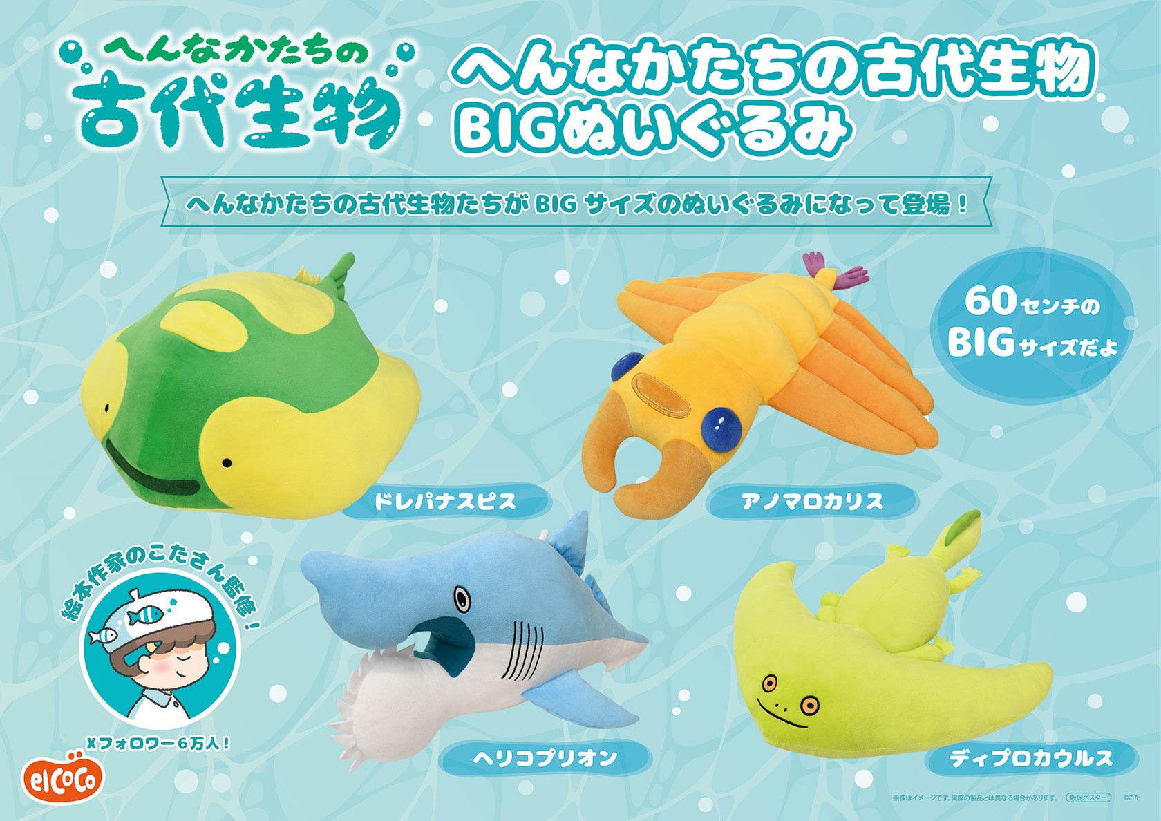 絵本作家・イラストレーター「こた」の『わくわく科学ずかん古生代水族館』に登場する人気の古代生物たちが約60cmのビッグサイズぬいぐるみに