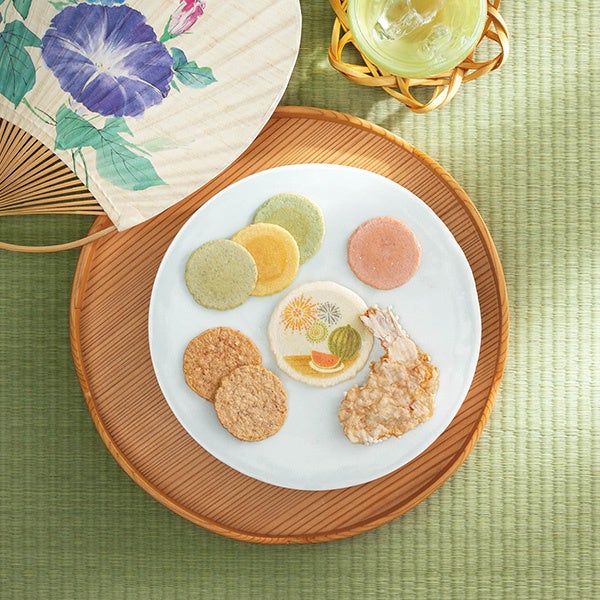 鉄板で一尾一尾丁寧に焼き上げた「磯焼き」、口いっぱいにえびの濃厚な旨味が広がる「赤えびの炙り焼き」や「えびアーモンド」。「梅」や「抹茶」など定番の味に加え、夏季限定の「夏みかん」や「紫蘇」、爽やかな「夏の風景」を描いたえびせんべい。8種類の味わいを詰合せました。