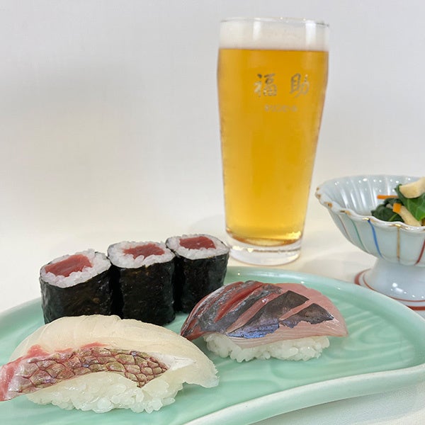 生ビール、小鉢、にぎり2カン(タイ・アジ)と鉄火巻のセットです。