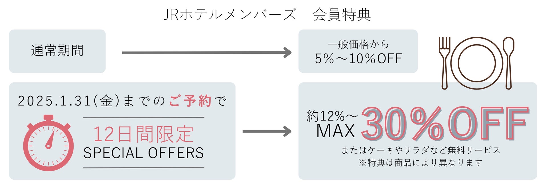 JRホテルメンバーズ会員様は通常、一般価格から5~10%割引でレストランをご利用いただけるところ、スペシャルオファー期間にご予約いただくと、ご利用期間中に一般価格から最大30%の割引やケーキやサラダのサービスなど、ホテルごとにお得な対象商品をご用意しております。(※1)