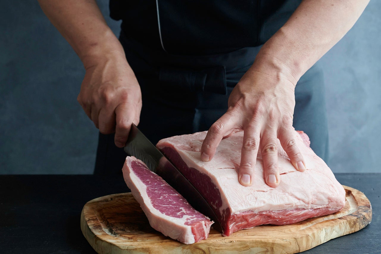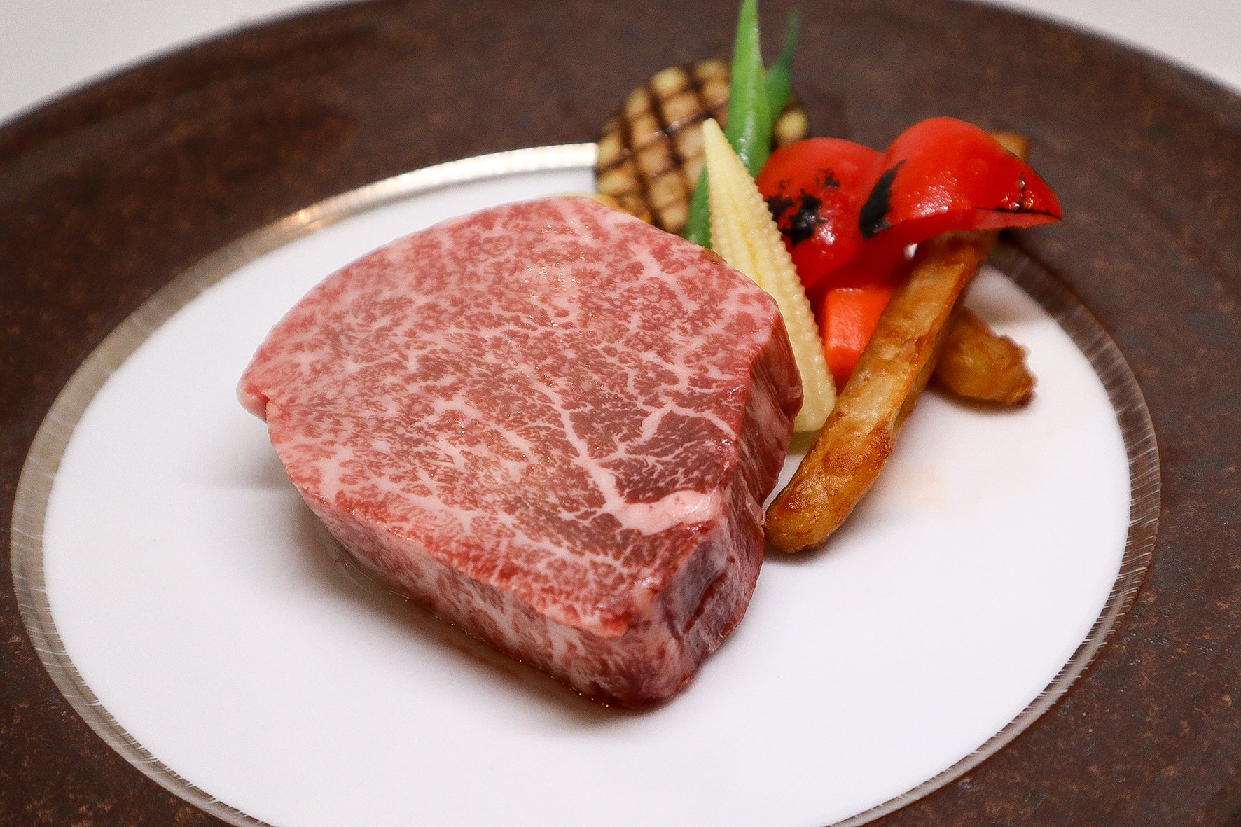 分厚くカット(100g)した黒毛和牛「フィレ肉」もしくは「モモ肉」を、ソテーし甘味を引き出した野菜と共にご提供します。