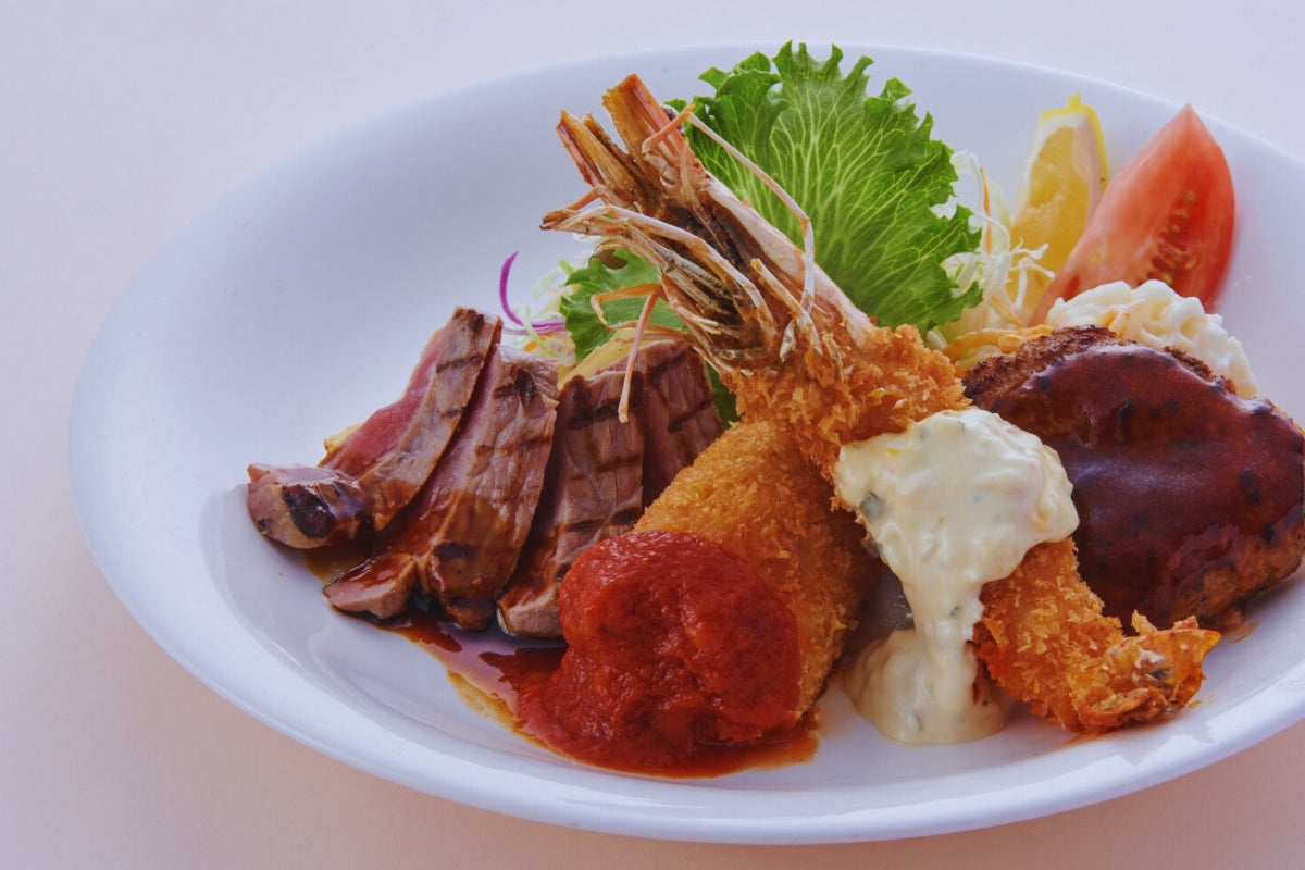 ハンバーグ・エビフライ・クリームコロッケ・牛肉のグリエの4種類が贅沢に楽しめる、大人もわくわくするラインナップ。