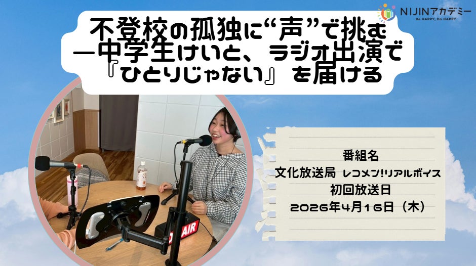 株式会社NIJIN(本社:東京都江東区、代表取締役:星野達郎)が運営する不登校オルタナティブスクール『NIJINアカデミー』に通う中学2年生の生徒が、2026年4月16,23,30日(木)23:30~23:40に文化放送局でオンエアされる、田中れいかのレコメン!リアルボイスに代表星野と出演することが決定いたしました。