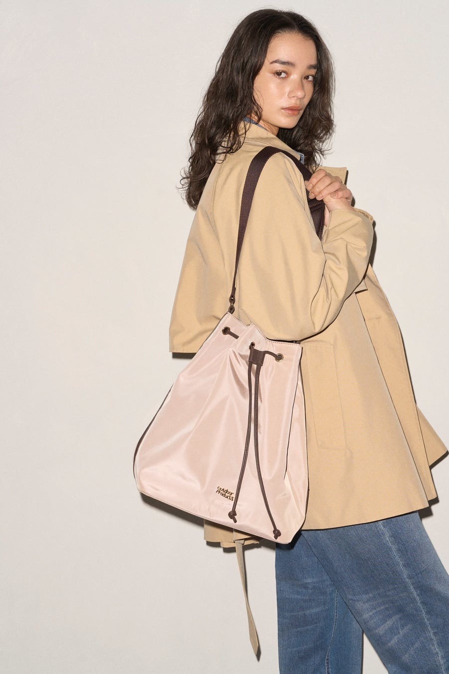 ロゴプレートが映える巾着デザインに、長さ調整可能なハンドルで肩掛け・斜め掛けの2WAY仕様、合皮パイピングの上品さとしっかりとした底マチによる高い収納力を備え、A4サイズにも対応したオンオフ問わず活躍するショルダートートバッグです。