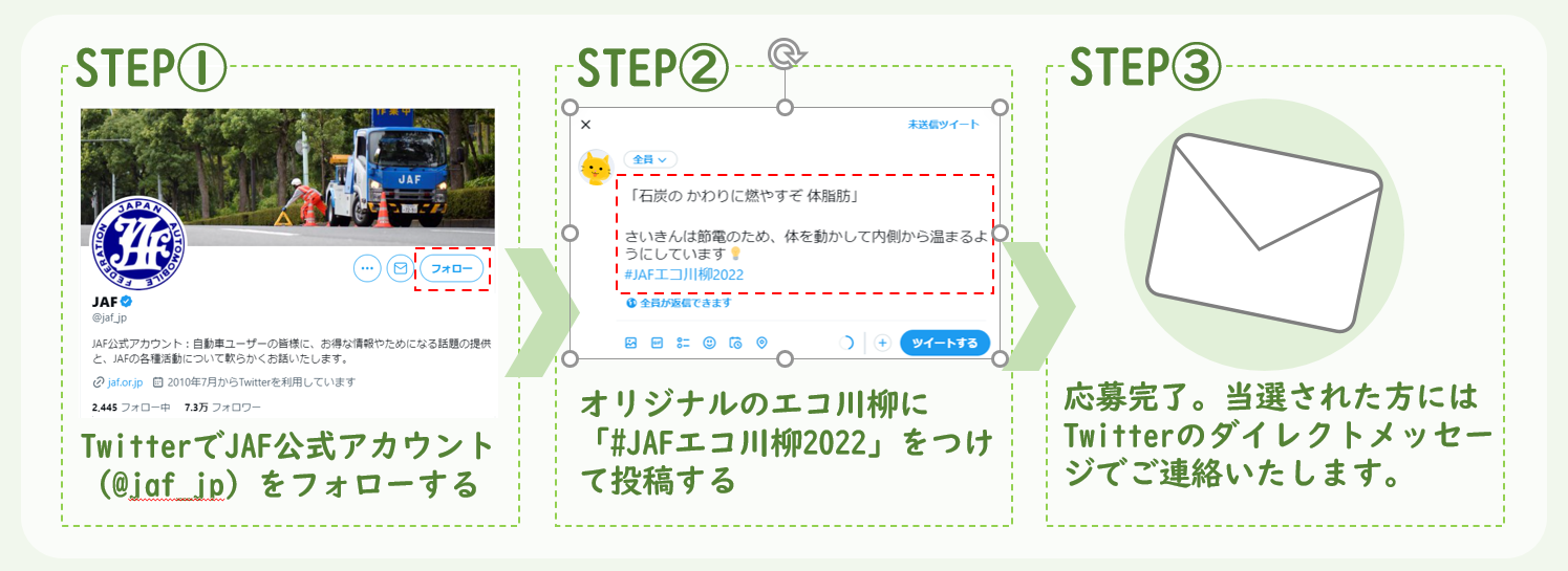 テーマに沿ったオリジナルのエコ川柳に「#JAFエコ川柳2022」をつけて投稿。