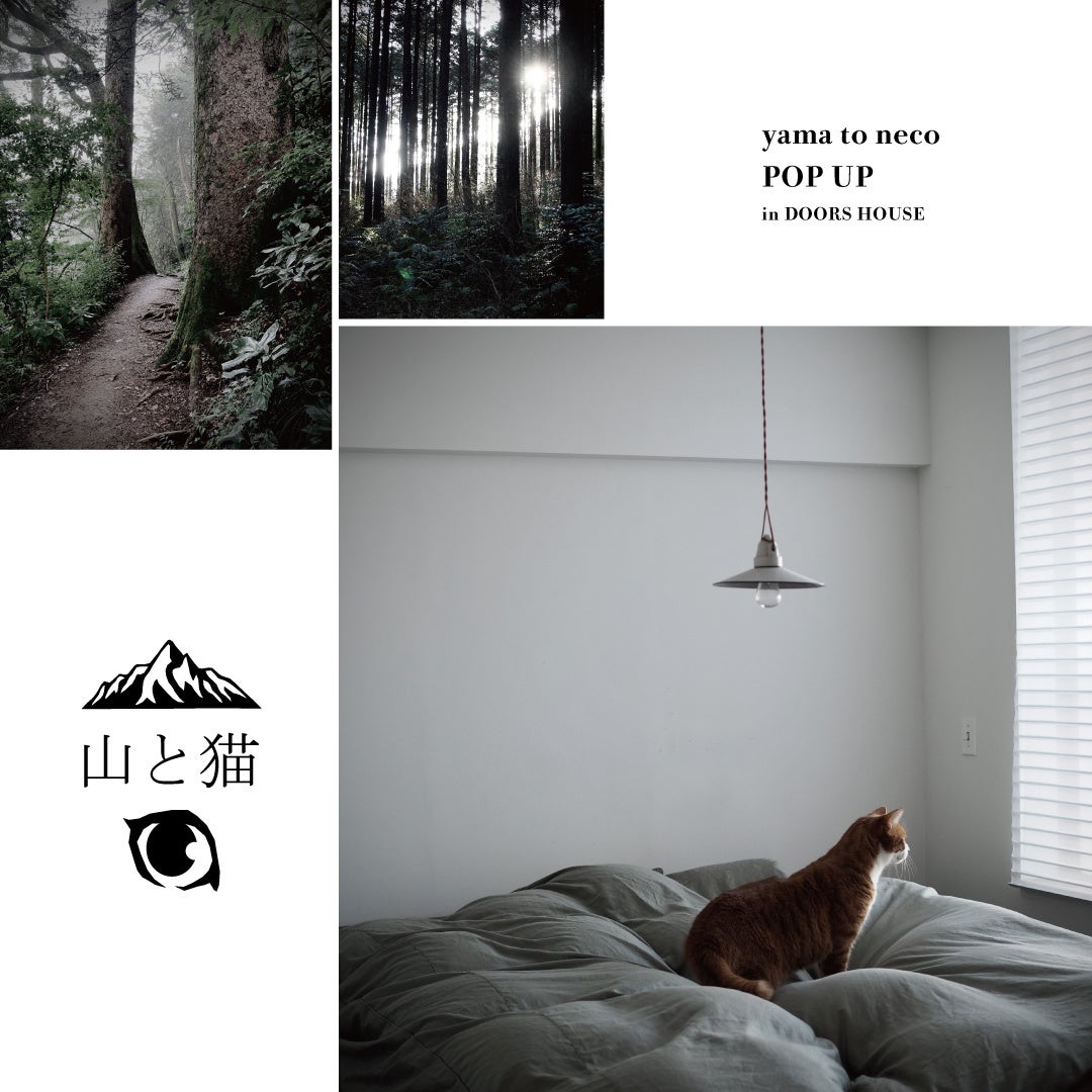 関西では初めてとなる「山と猫」の POP UP イベントを、DOORS HOUSE にて開催いたします。 コロナ禍の昨年、制約された行動の中で気付きや発見があり「山と猫」が生まれました。