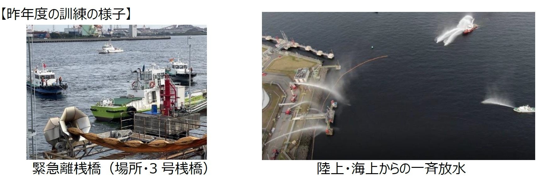 桟橋で揚油中の船舶受油導管からの航空燃料漏洩及び火災発生を想定し、防災資機材及び消火設備を活用した初期活動を迅速かつ確実に実行すると共に、関係機関との連携を強化することを目的とした消防総合訓練を下記のとおり実施します。