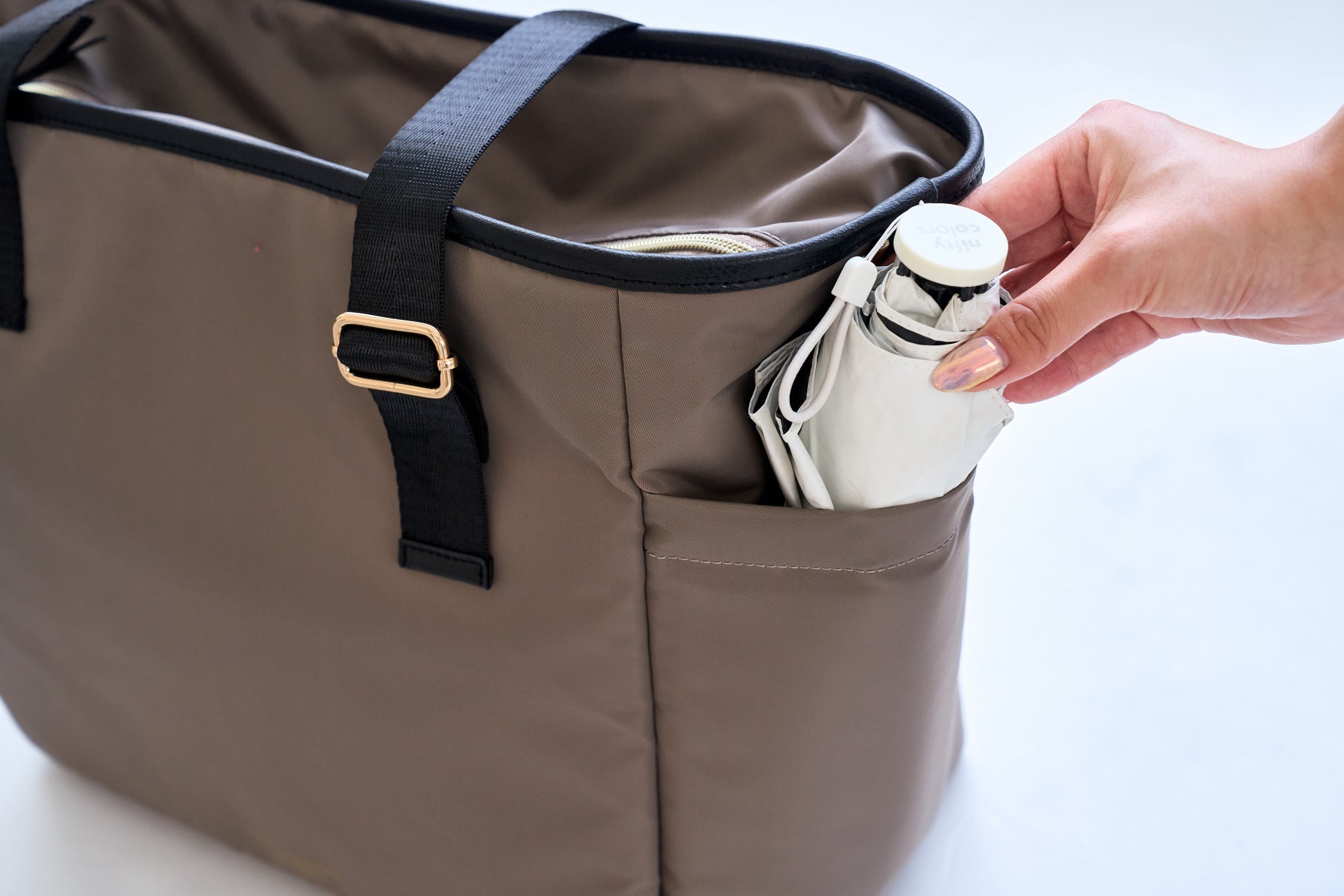 濡れた傘を入れても拭き取りやすい、ビニールを施した両サイドのアウトポケットもポイント。