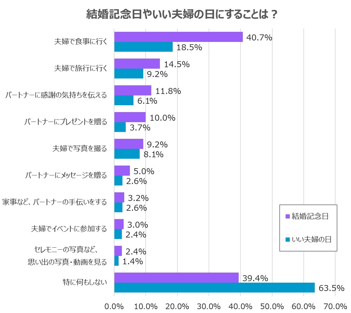 では、いつまでも理想の夫婦として幸せを感じるには、どうすればいいのでしょうか。夫婦で長い時を過ごす上で、大切にしたいのは記念日です。結婚している男女に、結婚記念日やいい夫婦の日に、どんなことをしているか聞いてみました。