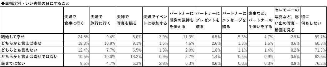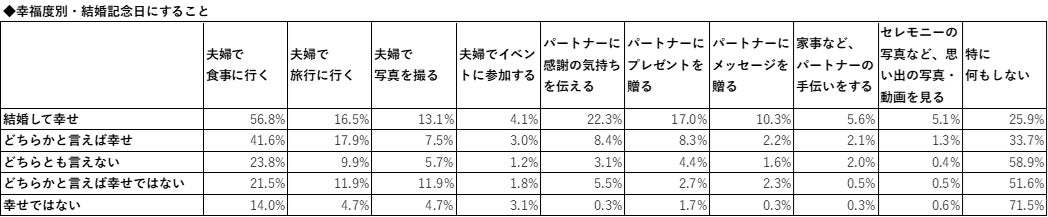 なお、幸福度別に見ると、いい夫婦の日や結婚記念日にお祝いをすると回答した夫婦は、結婚して「幸せ」「どちらかと言えば幸せ」と回答する傾向が相対的に高いこともわかりました。