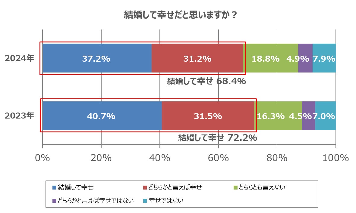 既婚の男女4,505人を対象に、「結婚して幸せだと思いますか?」と聞いたところ、「幸せ」と回答した人が37.2%、「どちらかと言えば幸せ」と回答した人が31.2%でした。昨年調査に比べると微減しているものの、既婚男女の68.4%は結婚して「幸せ」を感じていることが分かりました。