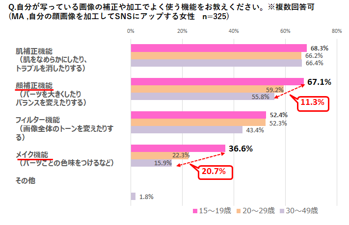 - 加工時に使用する機能は年代差あり!顔のパーツを加工する「顔補正」と「メイク」は、10代の使用率が特に高い