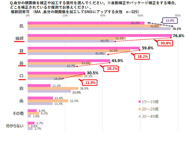 - 10代の加工するパーツは、輪郭が最多の7割越え!目・鼻・口も他の年代よりも加工率が高い!