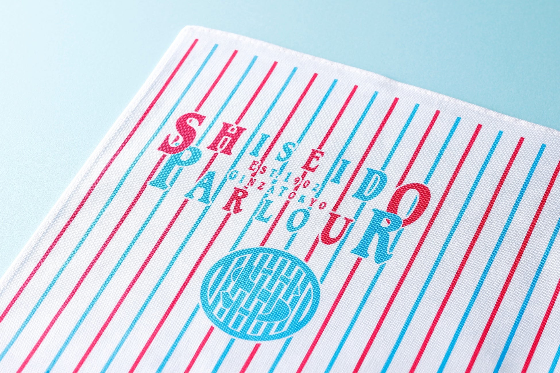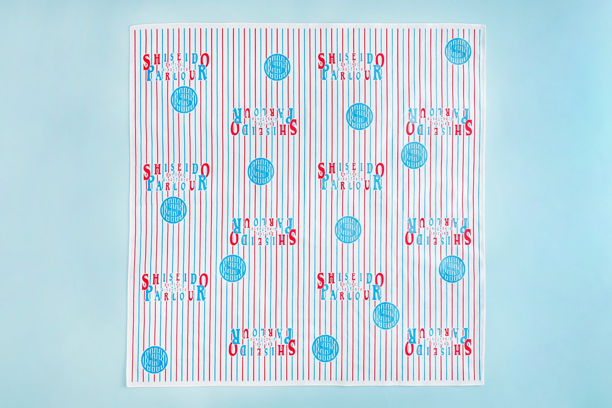「資生堂パーラー 銀座本店ショップ」にゆかた・和装でご来店のお客さまに先着で風呂敷をプレゼントいたします。鮮やかな青と赤のストライプに資生堂パーラーのロゴが印象的な風呂敷は、デザイナー仲條正義氏がデザインしたもの。大切な方への贈り物を包んだり、普段使いとしてお使いください。