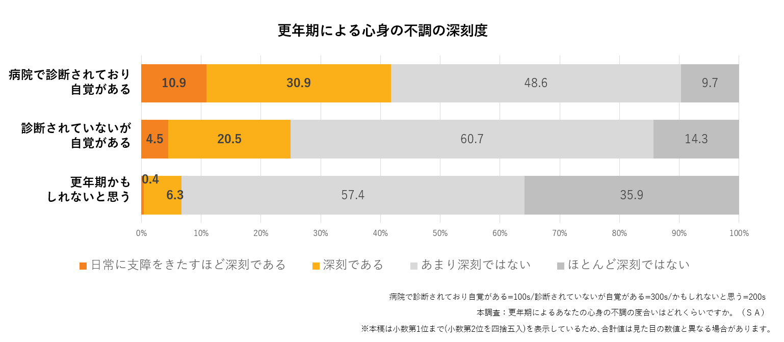 ・一方「診断されていないが自覚がある」人は25.0%、「更年期かもしれないと思う」人の深刻度は6.7%と低めの傾向にあることがわかった。