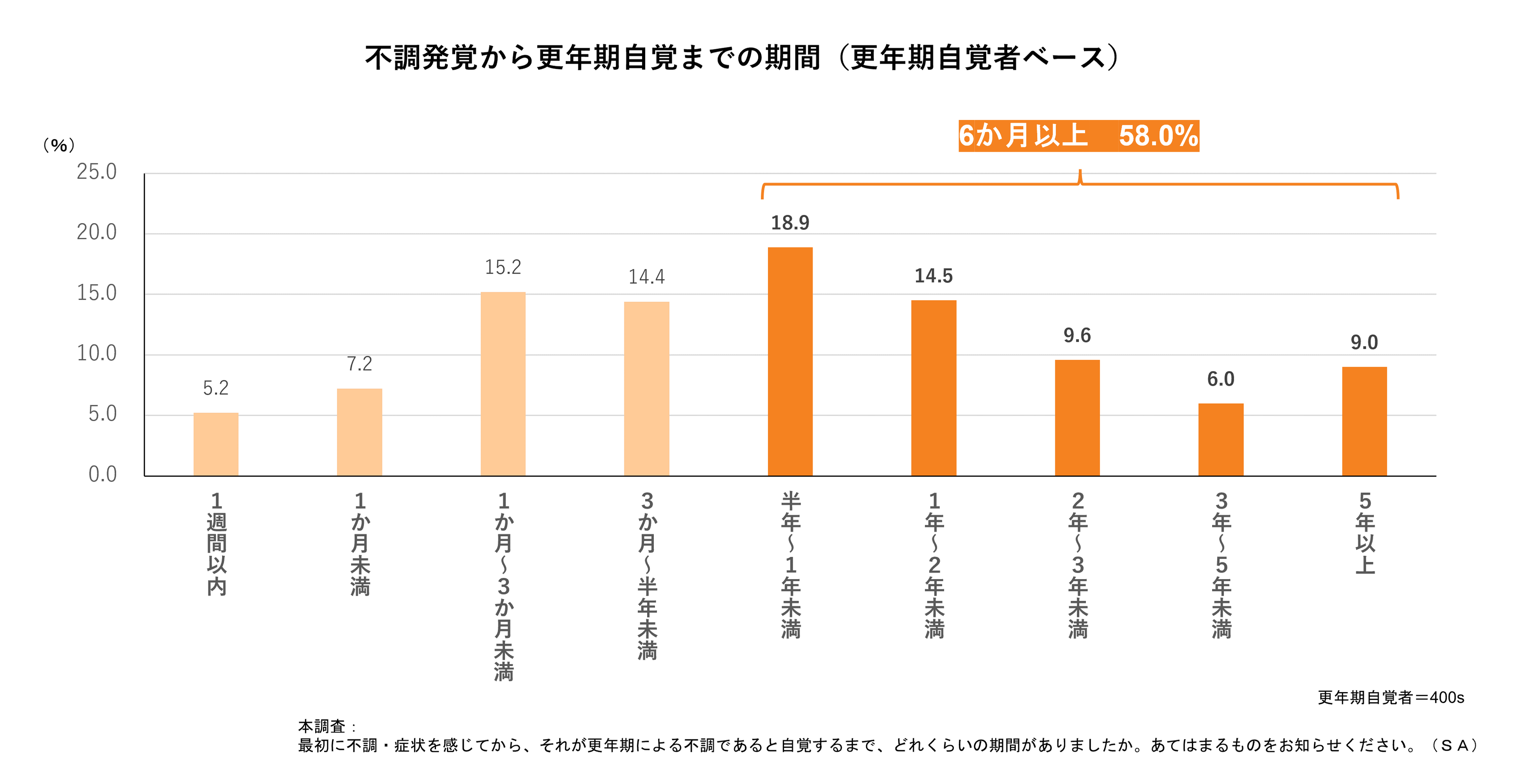更年期自覚者のうち、半年以内に自覚した人(早期自覚者)は約4割程度。一方、更年期の自覚に至るまで半年以上かかっている人は半数以上(58.0%)であり、不調が発生してから更年期だと気づくまでに相当なタイムラグが生じている。