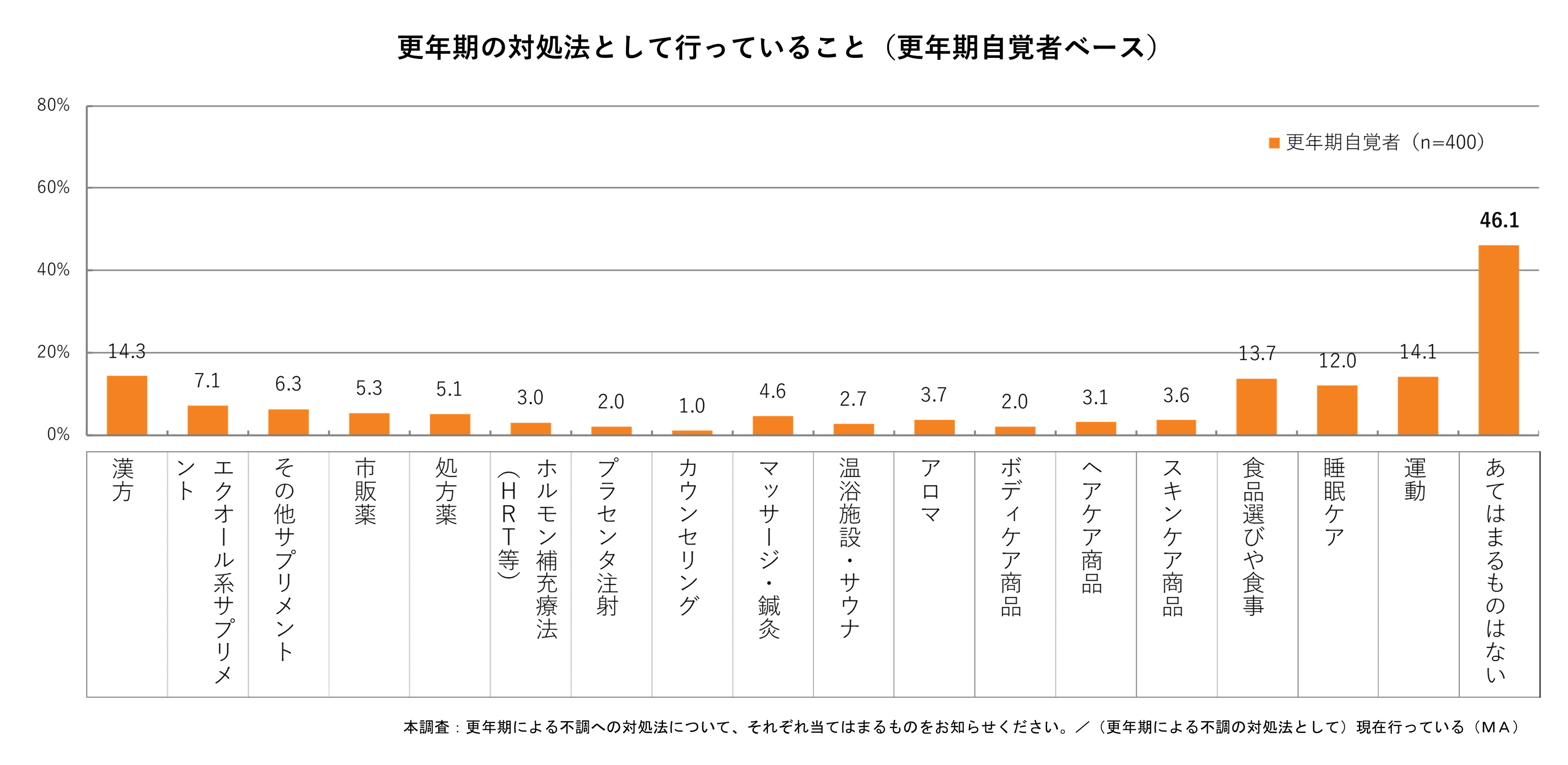 ・更年期自覚者における更年期による不調の対処法として行っていることについて聞いたところ、「漢方(14.3%)」「運動(14.1%)」「食品選びや食事(13.7%)」と具体的な対策法を挙げている人は少数派。