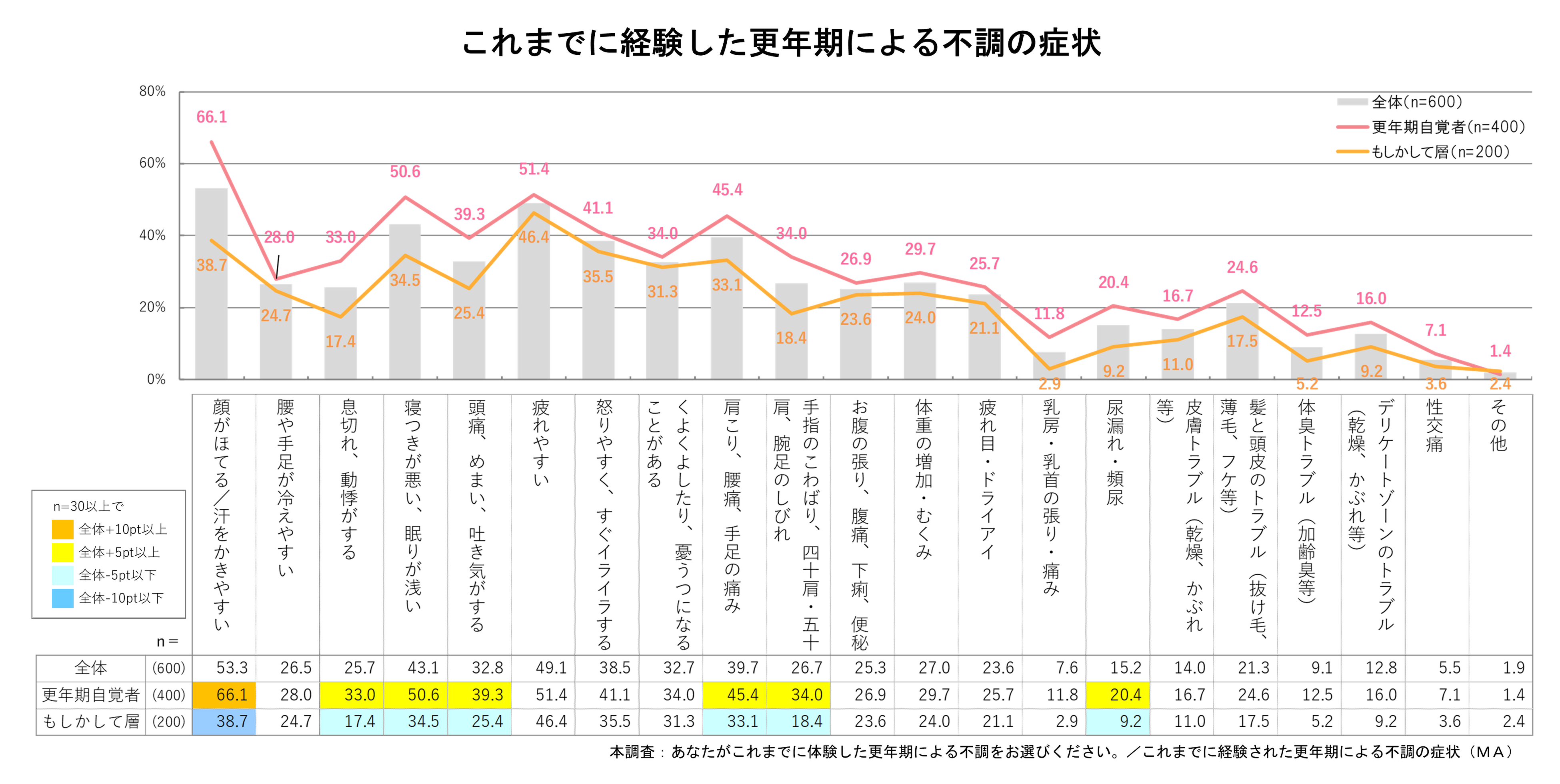更年期自覚者(ピンクの折れ線グラフ)は更年期による不調として、「顔がほてる/汗をかきやすい(66.1%)」以外にも「疲れやすい(51.4%)」「寝つきが悪い、眠りが浅い(50.6%)」「肩こり、腰痛、手足の痛み(45.4%)」等の様々な症状を感じている。様々な症状があり、かつそれぞれが感じる不調の形が異なっていることが、更年期を自覚しにくいことに関連している可能性を示している。