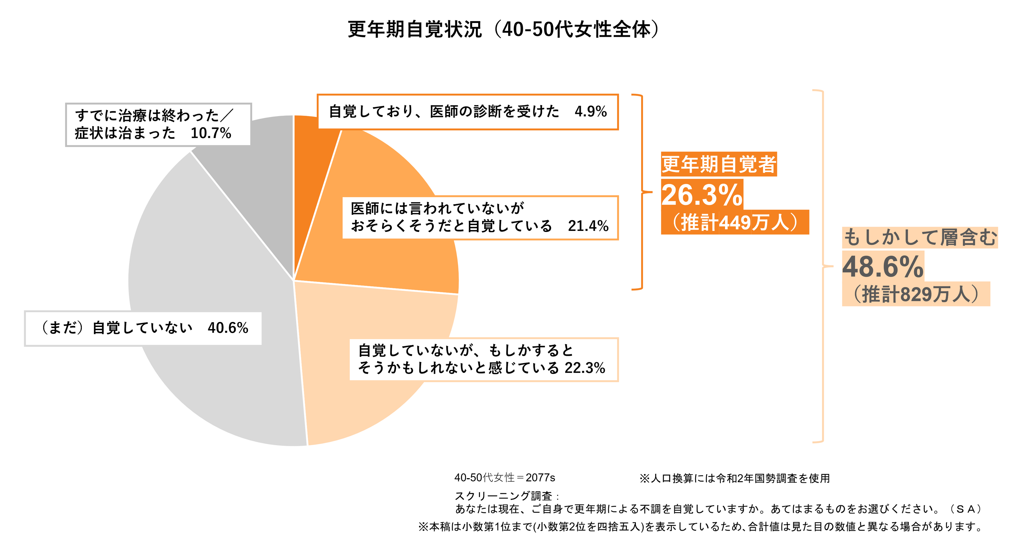 ・40-50代女性のうち、更年期による不調を自覚している人(更年期自覚者)は26.3%。全国の人口に換算すると約449万人と推計。