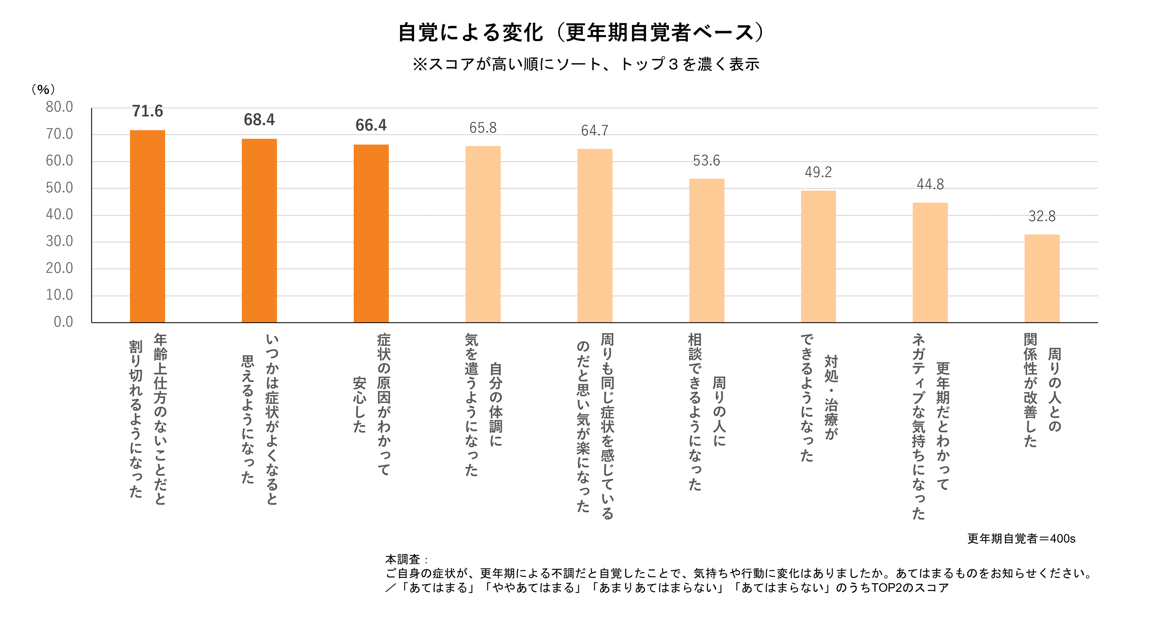 ・更年期を自覚したことによる気持ちや行動の変化では「年齢上仕方ないことだと割り切れるようになった(71.6%)」「いつかは症状が良くなると思えるようになった(68.4%)」「症状の原因が分かって安心した(66.4%)」「自分の体調に気を遣うようになった(65.8%)」などが上位に。不調の原因に気づくことで、気持ちの切り替えや受け入れが起こり、気持ちに変化が生じたのではないかと考えられる。