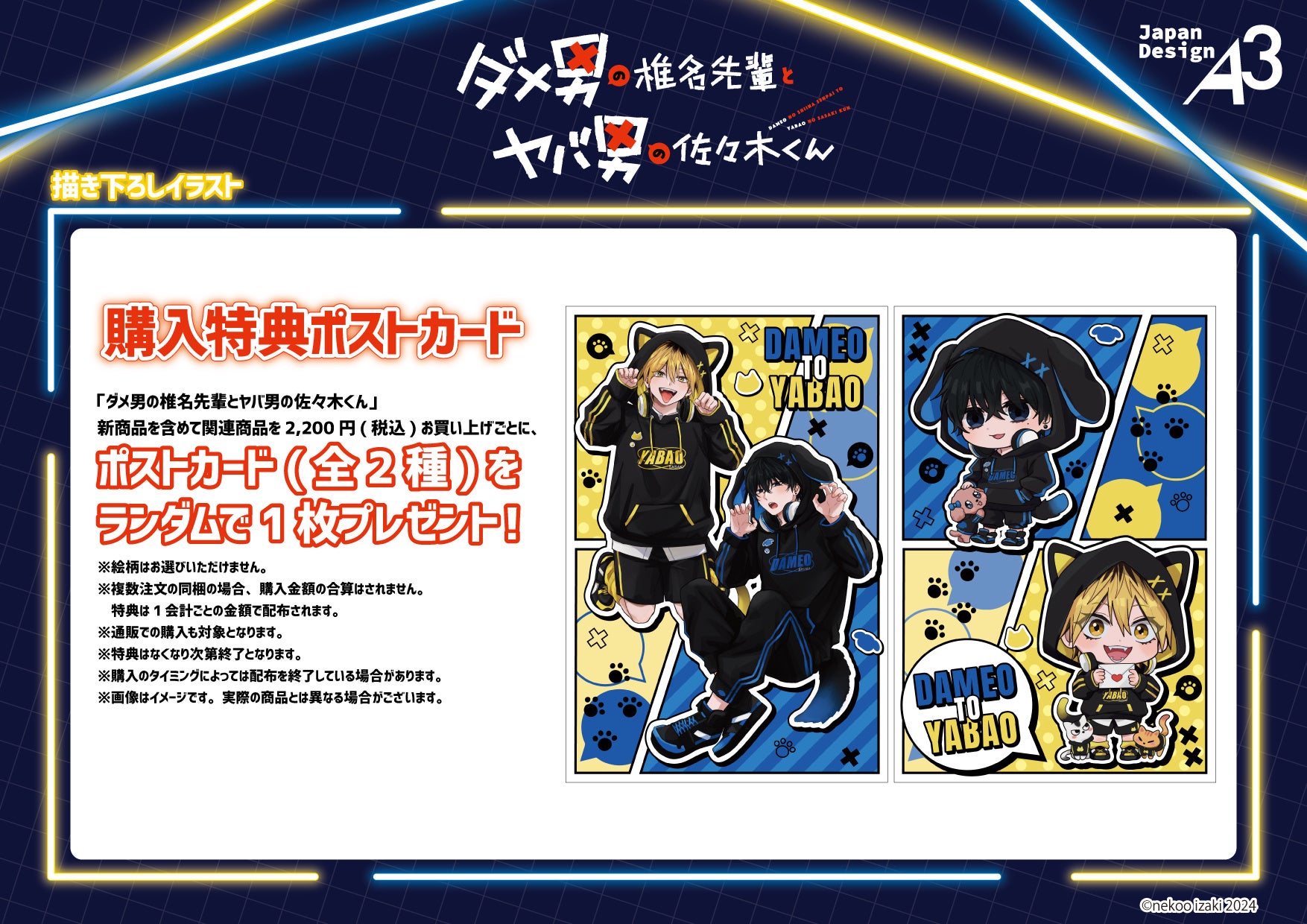 『ダメ男の椎名先輩とヤバ男の佐々木くん』新商品を含めて関連商品を1会計2,200円(税込)お買い上げごとに、購入特典としてポストカード(全2種)をランダムで1枚プレゼント。