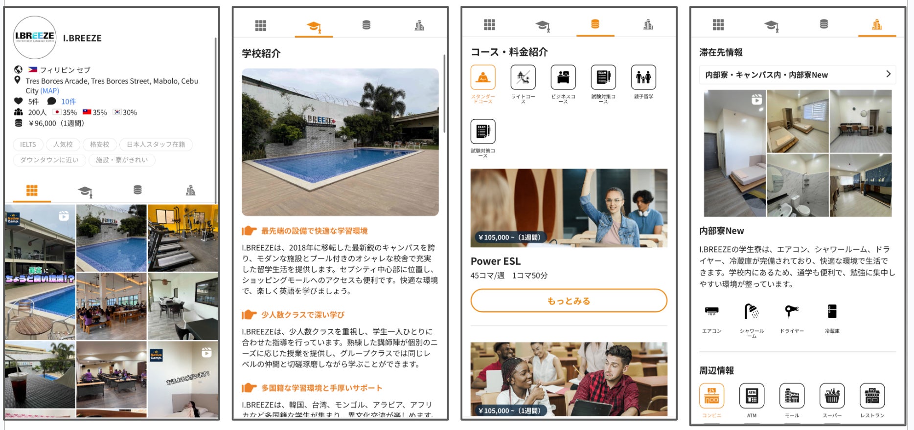 ネイティブキャンプ留学では、ユーザーが情報を分かりやすく把握できるよう、常に丁寧な情報提供を心がけています。I.BREEZEの詳細情報は、以下の4つのカテゴリーに分けて掲載しており、知りたい情報を的確にお届けします。