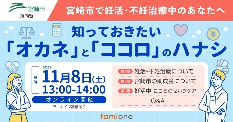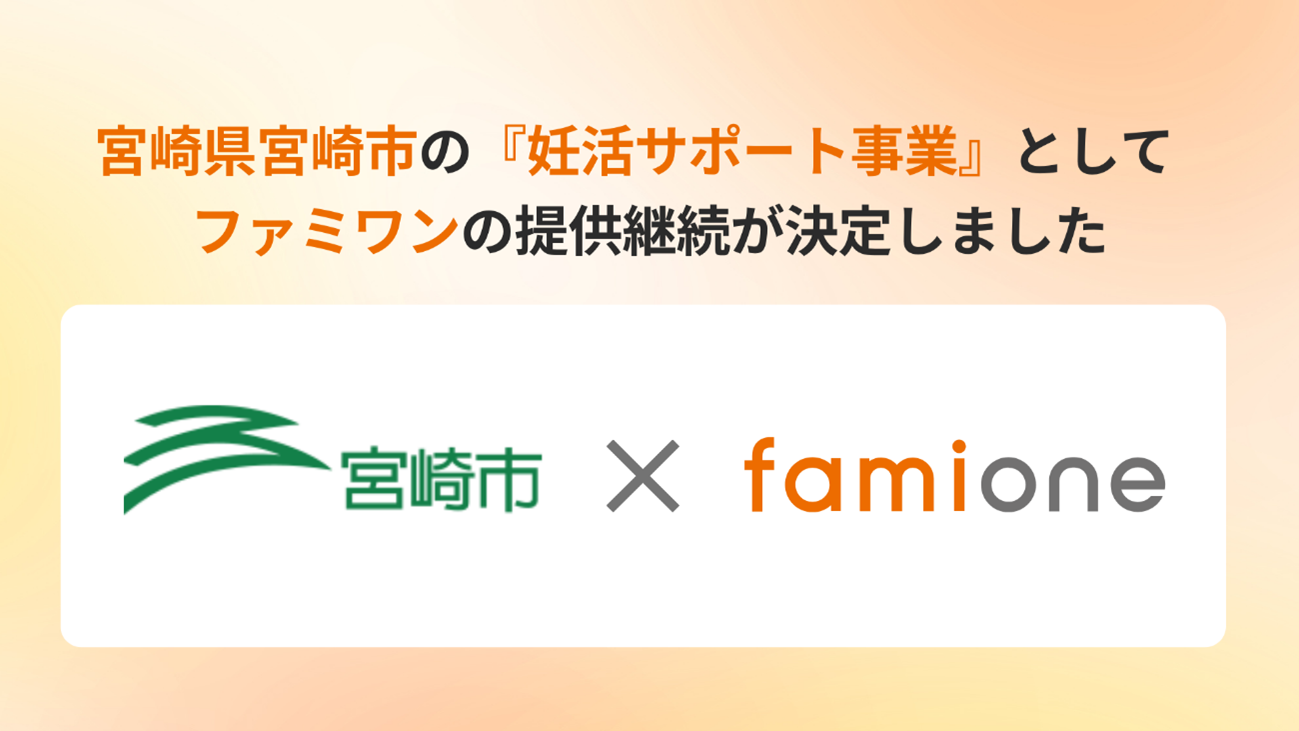 「子どもを願うすべての人によりそい 幸せな人生を歩める社会をつくる」をビジョンに掲げ、法人の従業員向け福利厚生や自治体の住民向け支援を行うヘルスケアサポートサービス「ファミワン」 https://famione.com/benefit/ などを展開する株式会社ファミワン(本社:東京都渋谷区、代表取締役:石川 勇介)は、宮崎県宮崎市(市長:清山 知憲、以下宮崎市)からの委託を受け、「妊活サポート事業」において、令和8年度のサービスの提供継続が決定いたしました。