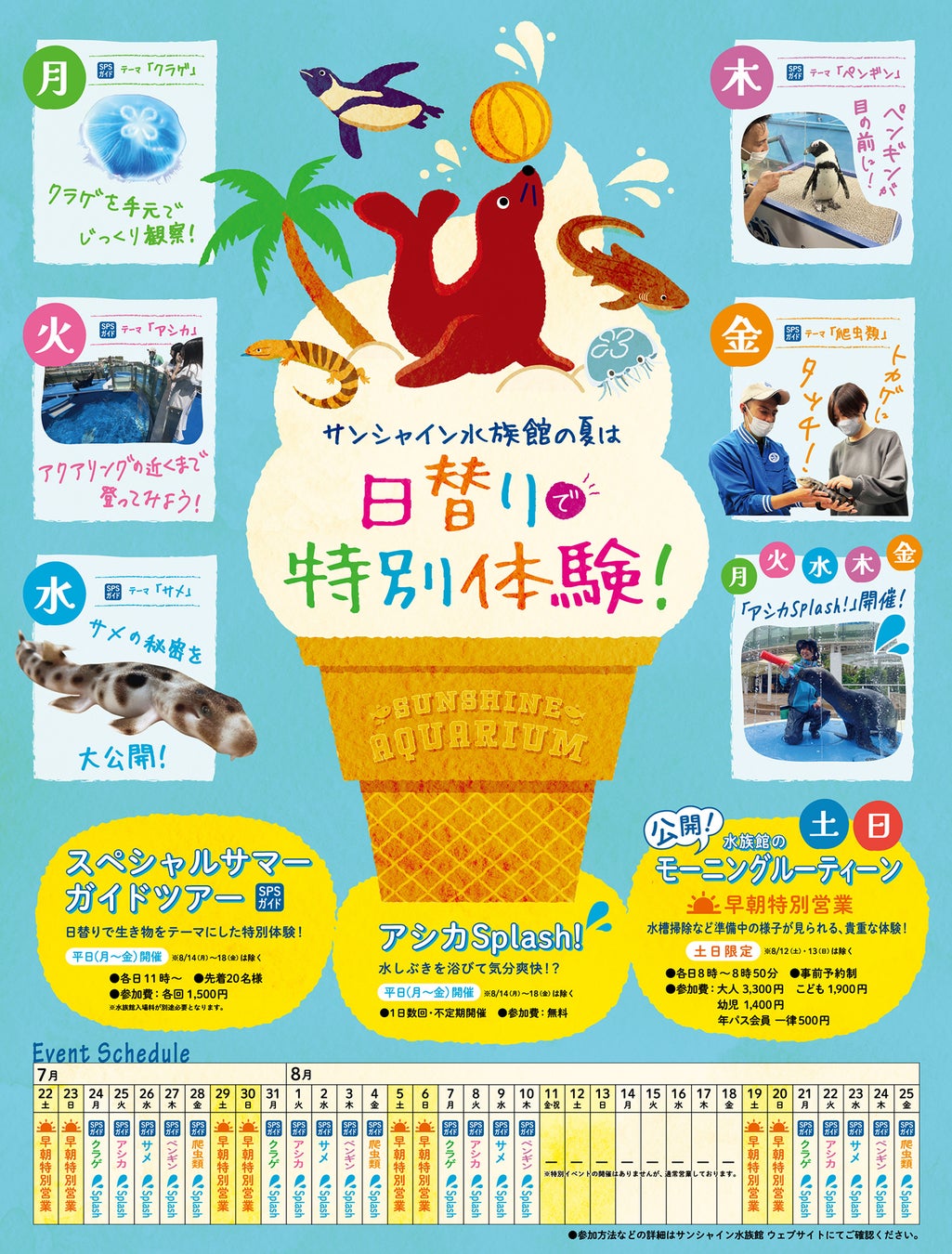 期間中の平日(8月14日(月)~18日(金)を除く)限定で、曜日ごとに異なる生き物に特化した内容でお届けする「スペシャルサマーガイドツアー」を実施するほか、普段行っているアシカトレーニングを夏特別ver.「アシカSplash!」としてお届け。「びちょぬれゾーン」を設け、水鉄砲や噴水等を使った清涼感たっぷりな夏仕様の演出で実施します。