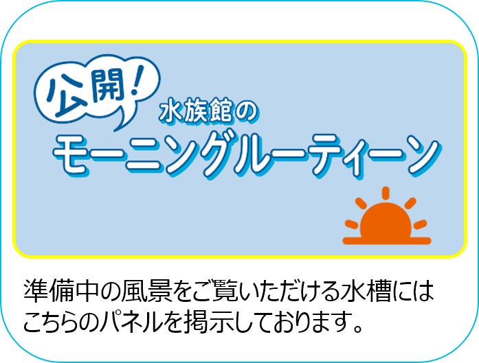 水槽掃除の様子をはじめ、普段は見られない準備中の風景を特別にご覧いただけるほか、一部の作業を飼育スタッフの解説付きでお楽しみいただけます。普段は見られない開館前の作業中の水槽にはパネルを掲示しておりますので、是非パネルを探してみてください。