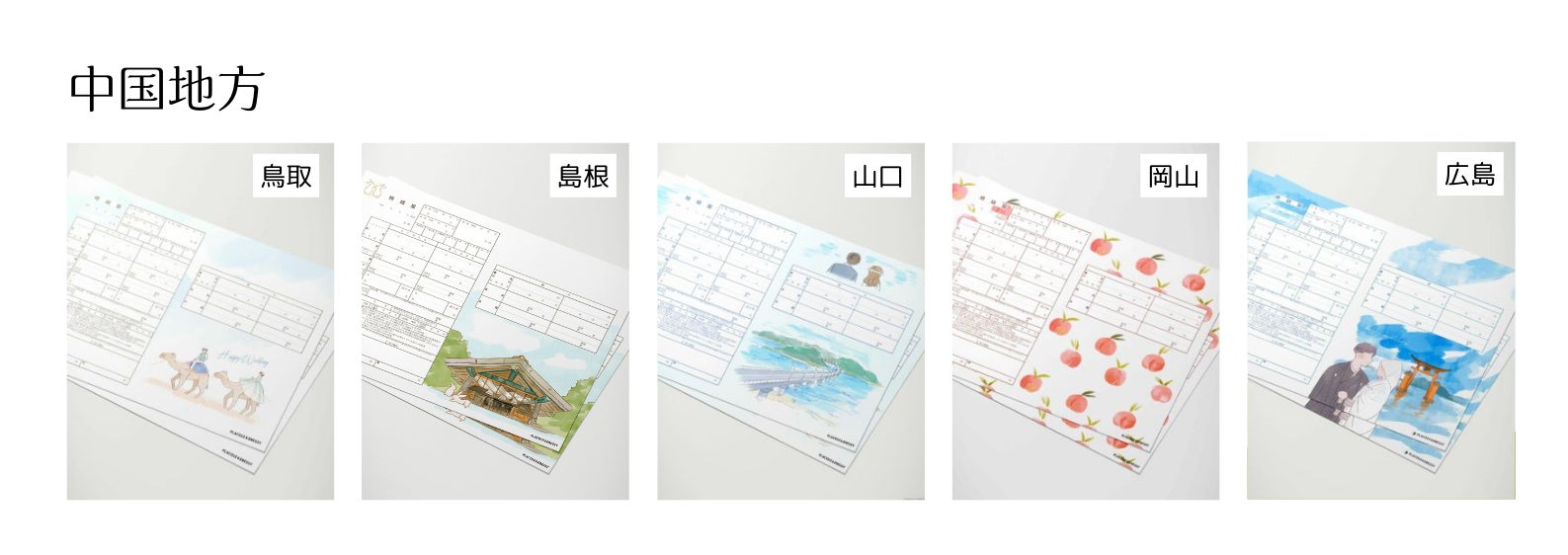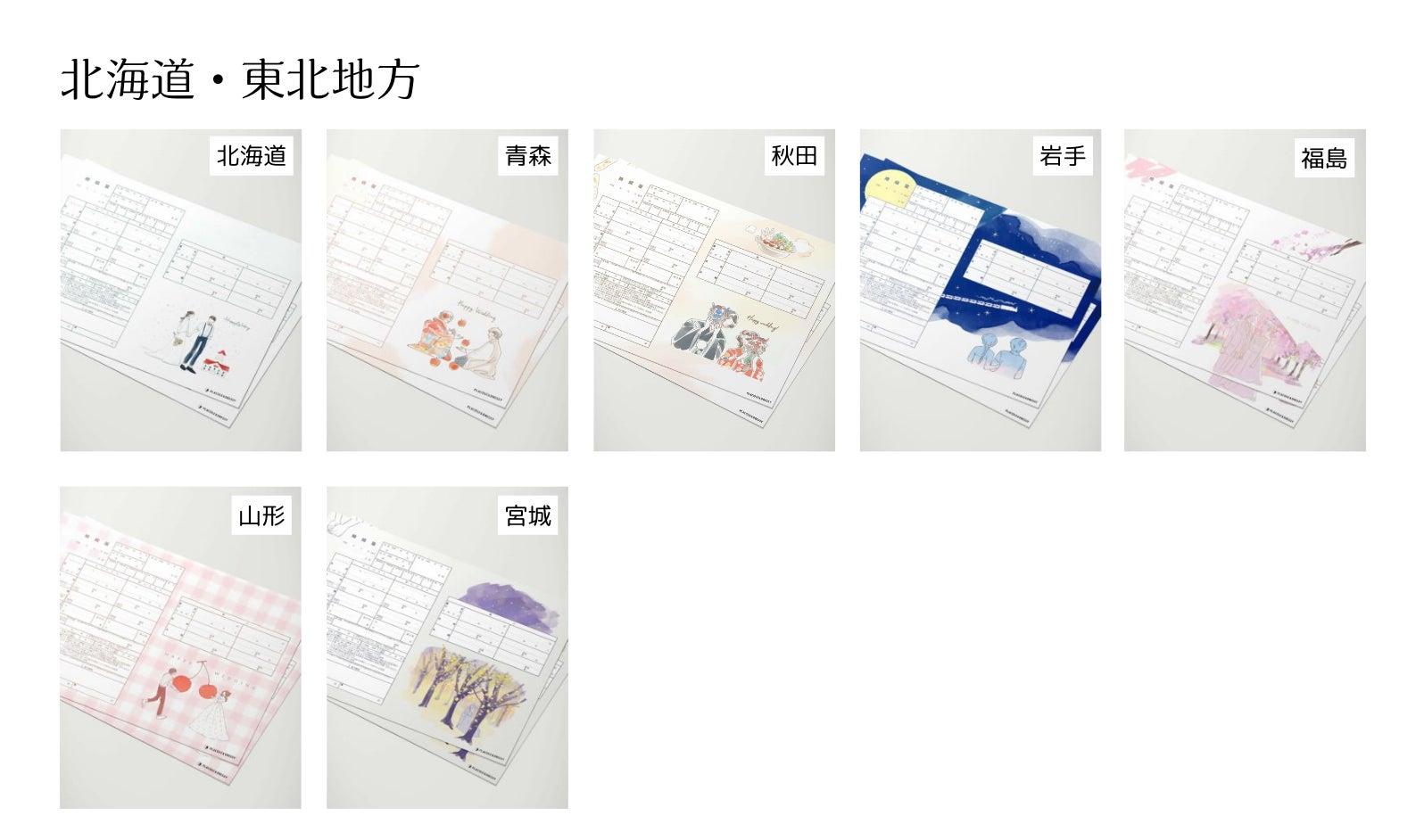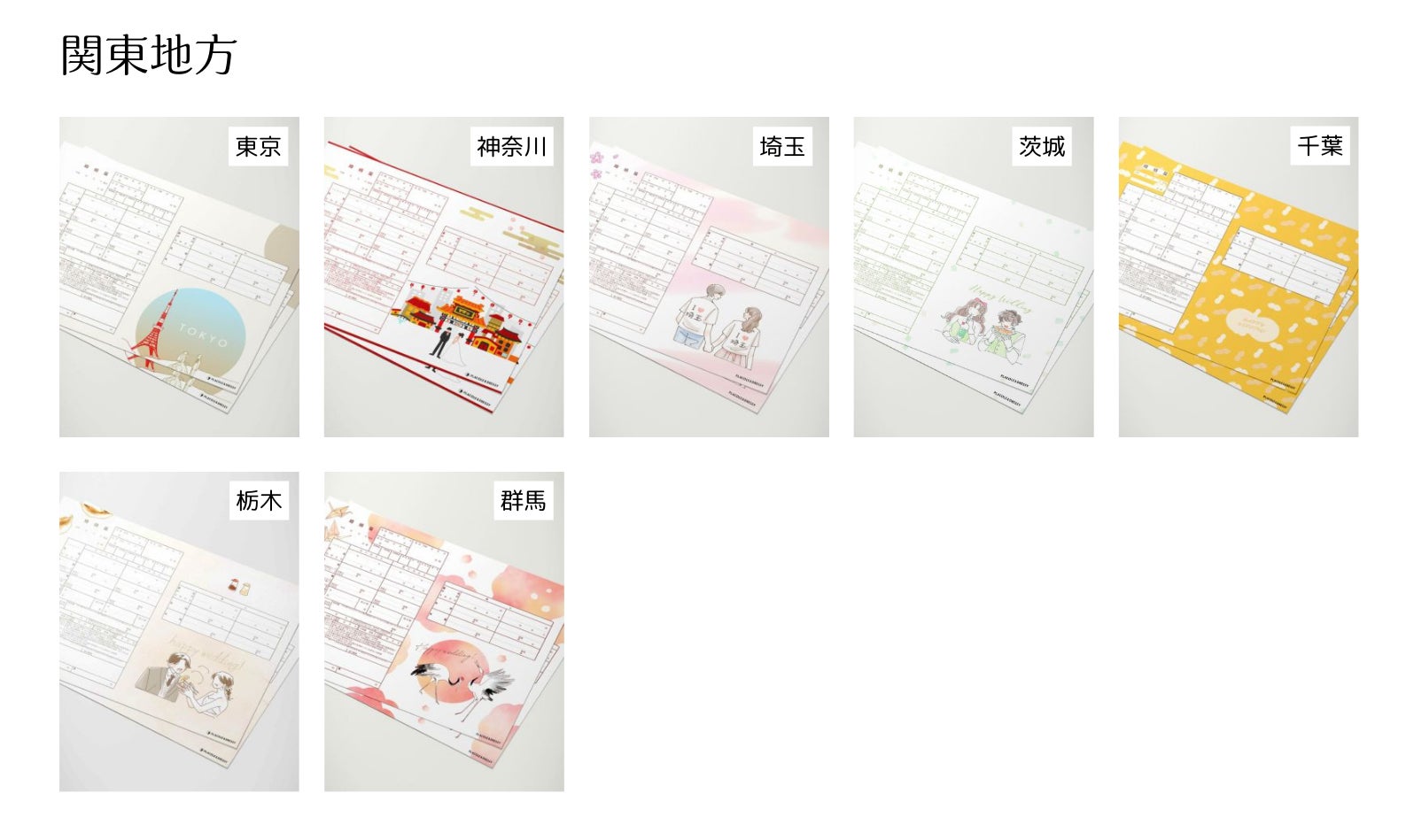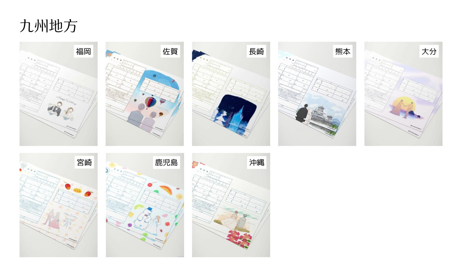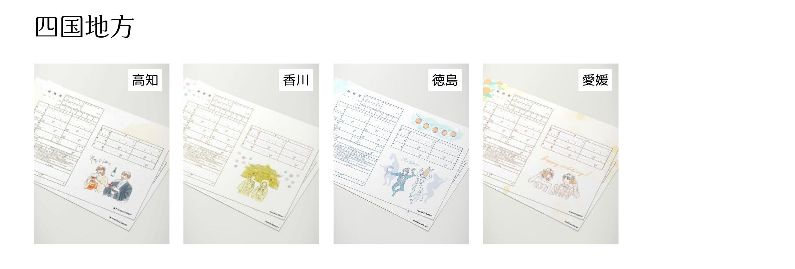 各都道府県の婚姻届には、その地域ならではの文化や名所、特産品が反映され、地域ごとにカップルの特別な想い出や縁をデザインに取り入れたものが揃っています。