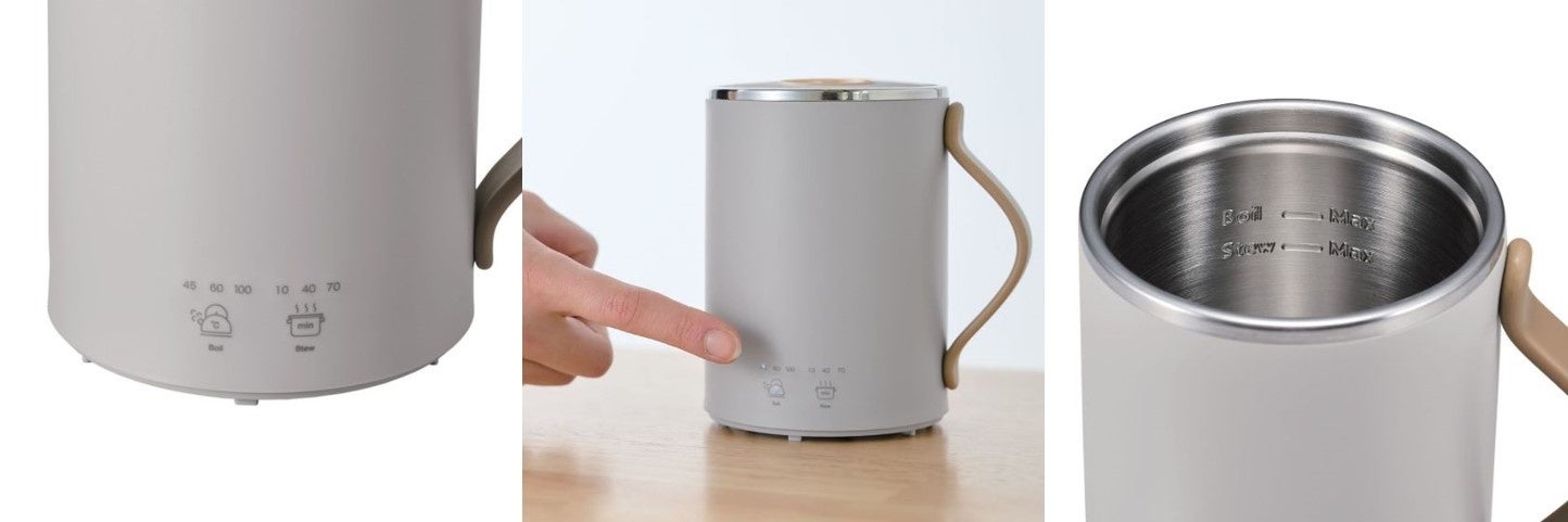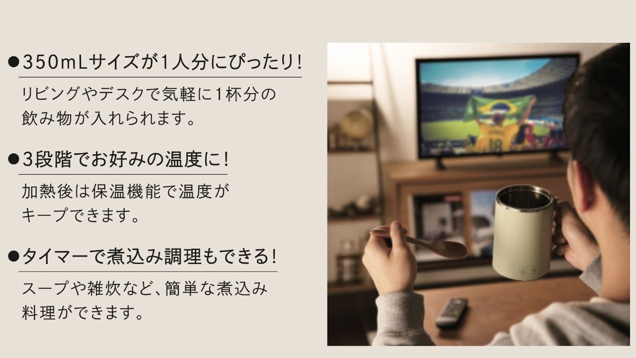 ■マグカップ型の器具1台で、手軽に「沸かす・煮る・保温する」が可能です。料理やドリンクが完成するまでずっとキッチンに立っている必要がなくなります。