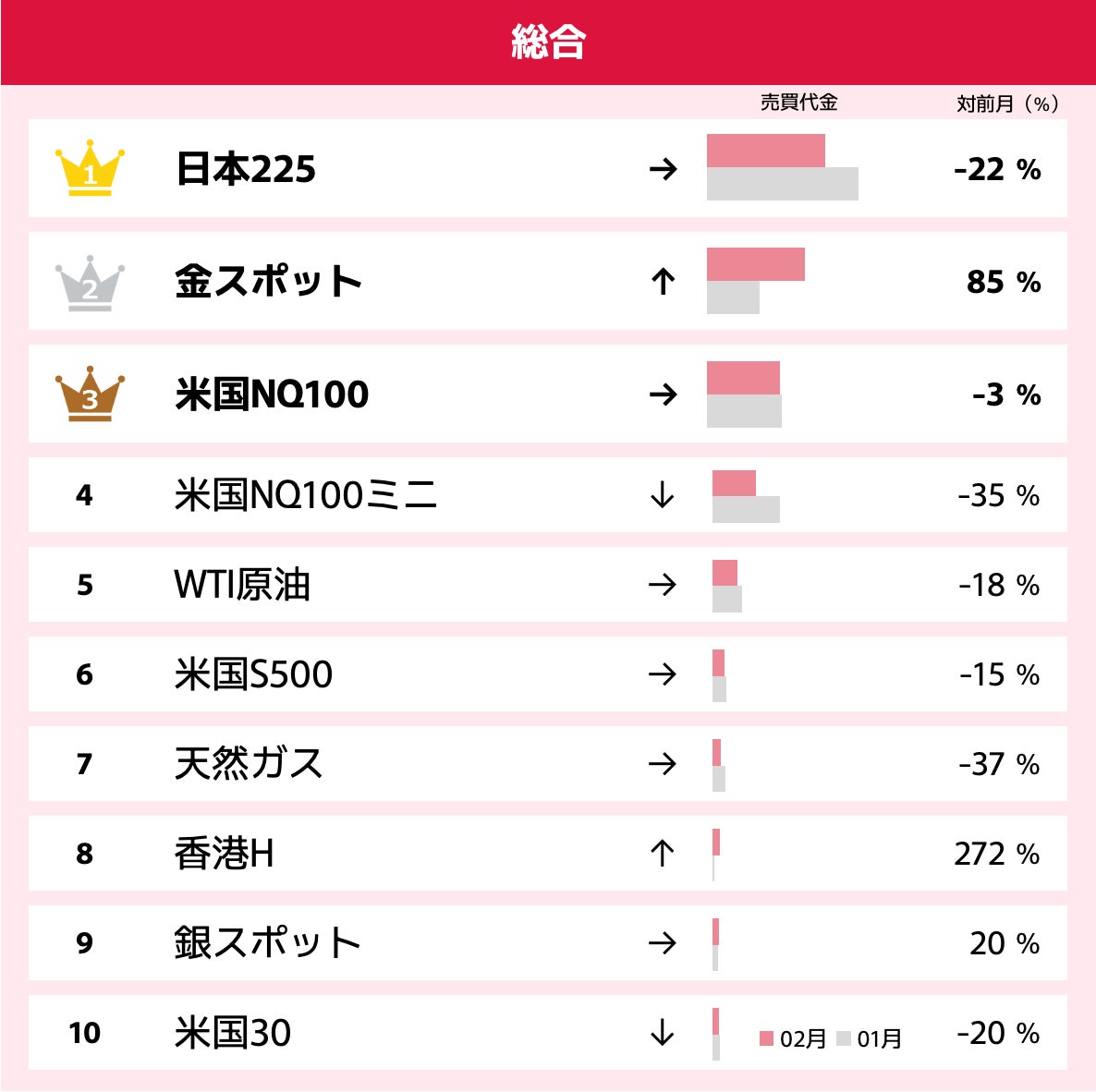 総合ランキングでは「日本225」が首位となり、「金スポット」「米国NQ100」が続きました。バラエティCFDランキングは「米国VI」、商品CFDランキングでは「金スポット」、外国株CFDランキングでは「NVIDIA」が首位となりました。