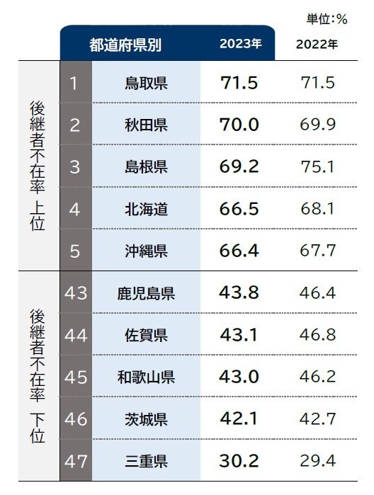 後継者不在率が最も高いのは「鳥取県」で、全国平均を大幅に上回る71.5%だった。不在率が70%台となったのは、鳥取県のほか「秋田県」(70.0%)の2県のみだった。2011-20年の調査まで一貫して全国で不在率がトップだった沖縄県も低下が続き、全国5番目の水準となった。