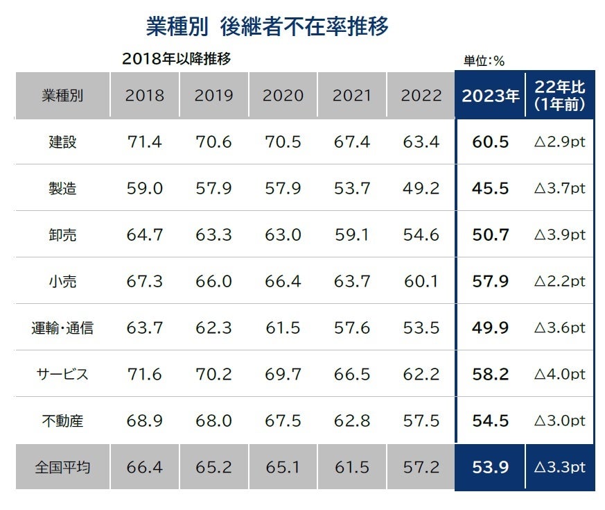 日本企業の「後継者問題」は改善傾向が続いている。2023年の全国・全業種約27万社における後継者動向について調査した結果、後継者が「いない」、または「未定」とした企業は14.6万社に上った。この結果、全国の後継者不在率は53.9%となり、22年から3.3pt低下した。6年連続で前年の水準を下回ったほか、コロナ前の19年からも11.3pt低下するなど、大幅な改善傾向が続いた。また、調査を開始した2011年以降、不在率は過去最低を更新した。
