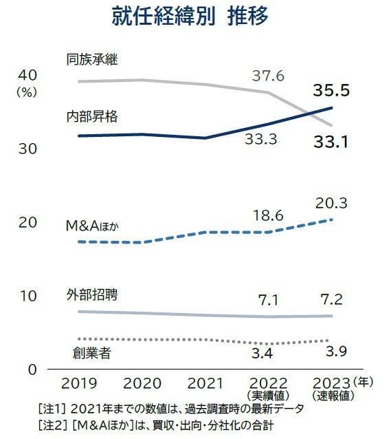 事業承継、「内部昇格」が35.5%、就任経緯で初のトップ 「脱ファミリー」化加速