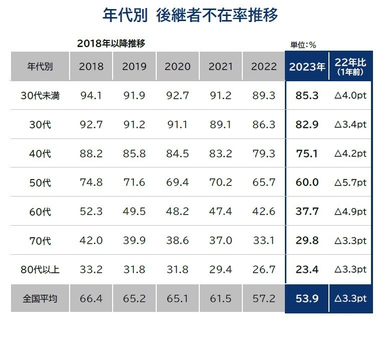 2023年の後継者策定動向は、引き続き50~60歳の「現役世代」を中心に大幅な低下傾向が目立った。「50代」の後継者不在率は60.0%と、全国平均に比べて高いものの、前年からの低下幅は全年代で最大となる5.7pt減だった。事業承継の適齢期にあたる「60代」も50代に次いで低下幅が大きく(4.9pt減)、初めて40%を下回った。「70代」(29.8%)も初めて30%を下回った。また、全年代で後継者不在率は過去最低を更新した。