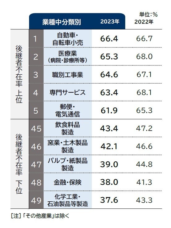 業種をより細かくみると(中分類)、最も不在率が高いのは自動車ディーラーなど「自動車・自転車小売」の66.4%となり、病院・診療所(クリニック)など「医療業」65.3%が続いた。最も不在率が低いのは「化学工業・石油製品等製造」の37.6%で40%を下回る水準だった。