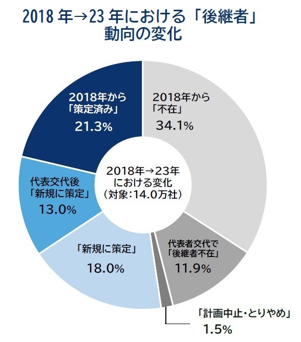 一方、2018年時点では後継者候補がいたにも関わらず、23年に後継者不在となった「計画中止・とりやめ」が全体の1.5%・約2000社で判明した。経営環境の急激な変化により事業承継を中断したケースや、現経営者による後継者選びの見直し、あるいは後継者候補だった人物の辞退や退社といったケースなど、事業承継が中断・頓挫した要因は多岐にわたった。