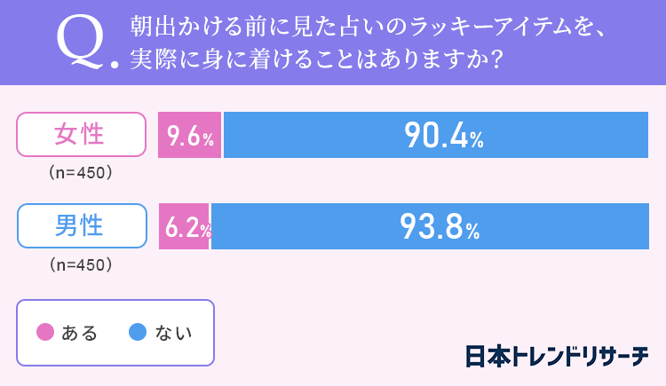 女性の9.6%、男性の6.2%が、朝出かける前に見た占いのラッキーアイテムを、実際に身に着けることは「ある」と答えました。