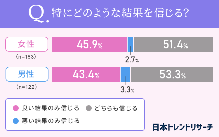 男女ともに「悪い結果のみ信じる」方は3%ほどという結果となり、半数近くが「どちらも信じる」と回答しました。