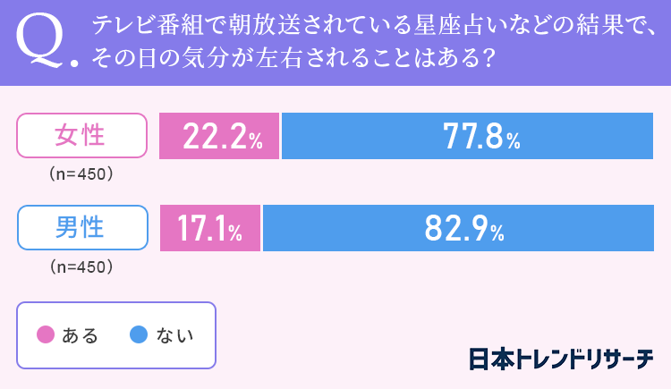 女性は22.2%、男性は17.1%と、それぞれ2割近くが、占いの結果でその日の気分が左右されることは「ある」と答えました。