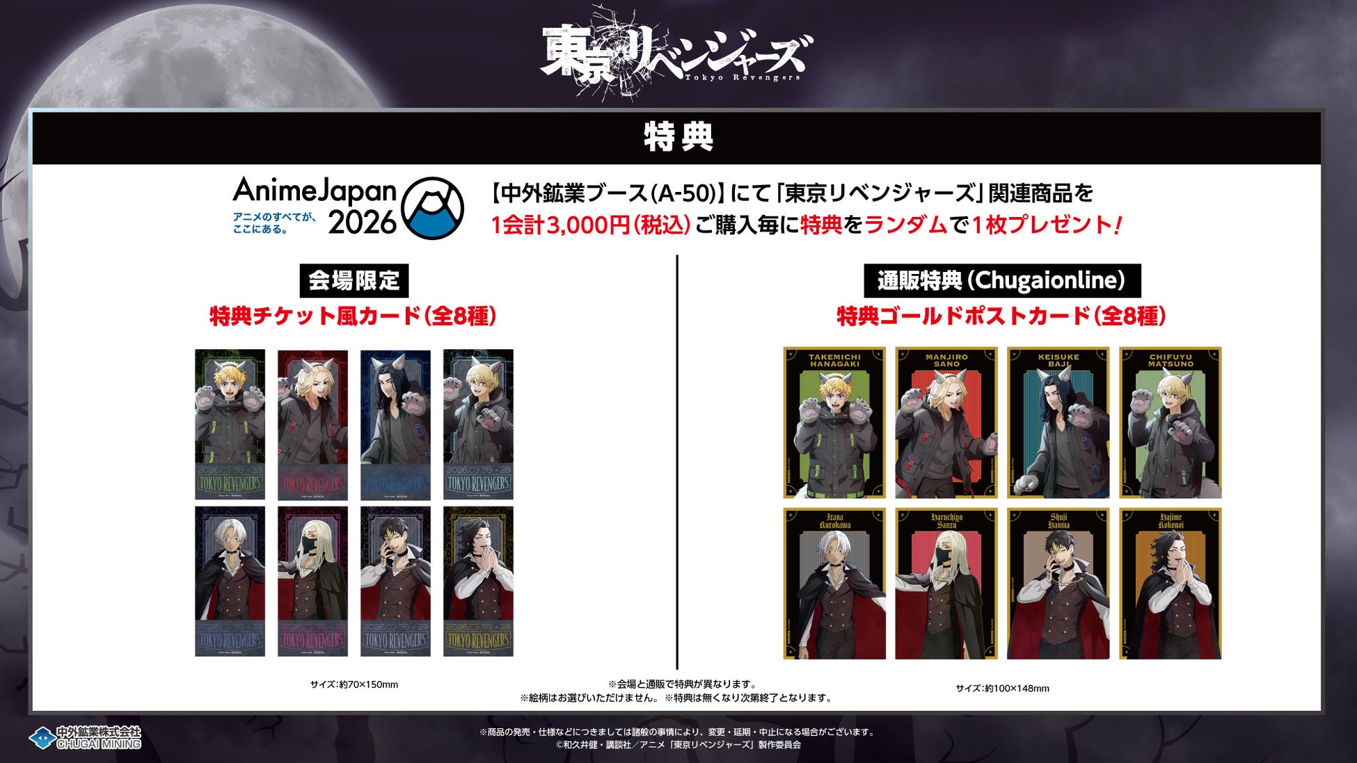 中外鉱業ブースにてTVアニメ『東京リベンジャーズ』AnimeJapan 2026関連商品を1会計3,000円(税込)ご購入毎に、特典チケット風カード(全8種)をランダムで1枚お渡しいたします!