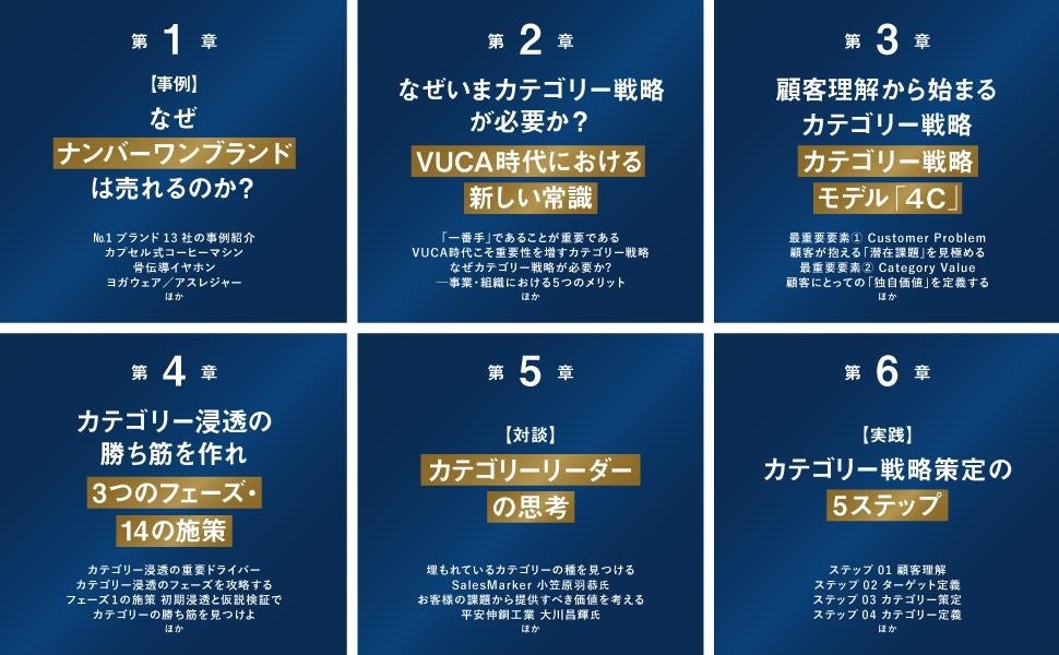 カテゴリー戦略とは、顧客が抱える潜在課題を解決する独自価値を提供し、その価値を「カテゴリー」として顧客の頭の中に定着させることで、競合と比較されない「一番手」のポジションを確立する戦略です。たとえば、「○○と言えば○○」といったように、本書では、「頭に浮かべば、モノは売れる」という原則に基づき、顧客の頭の中に確固たるポジションを築くための実践的な方法論を提示します。