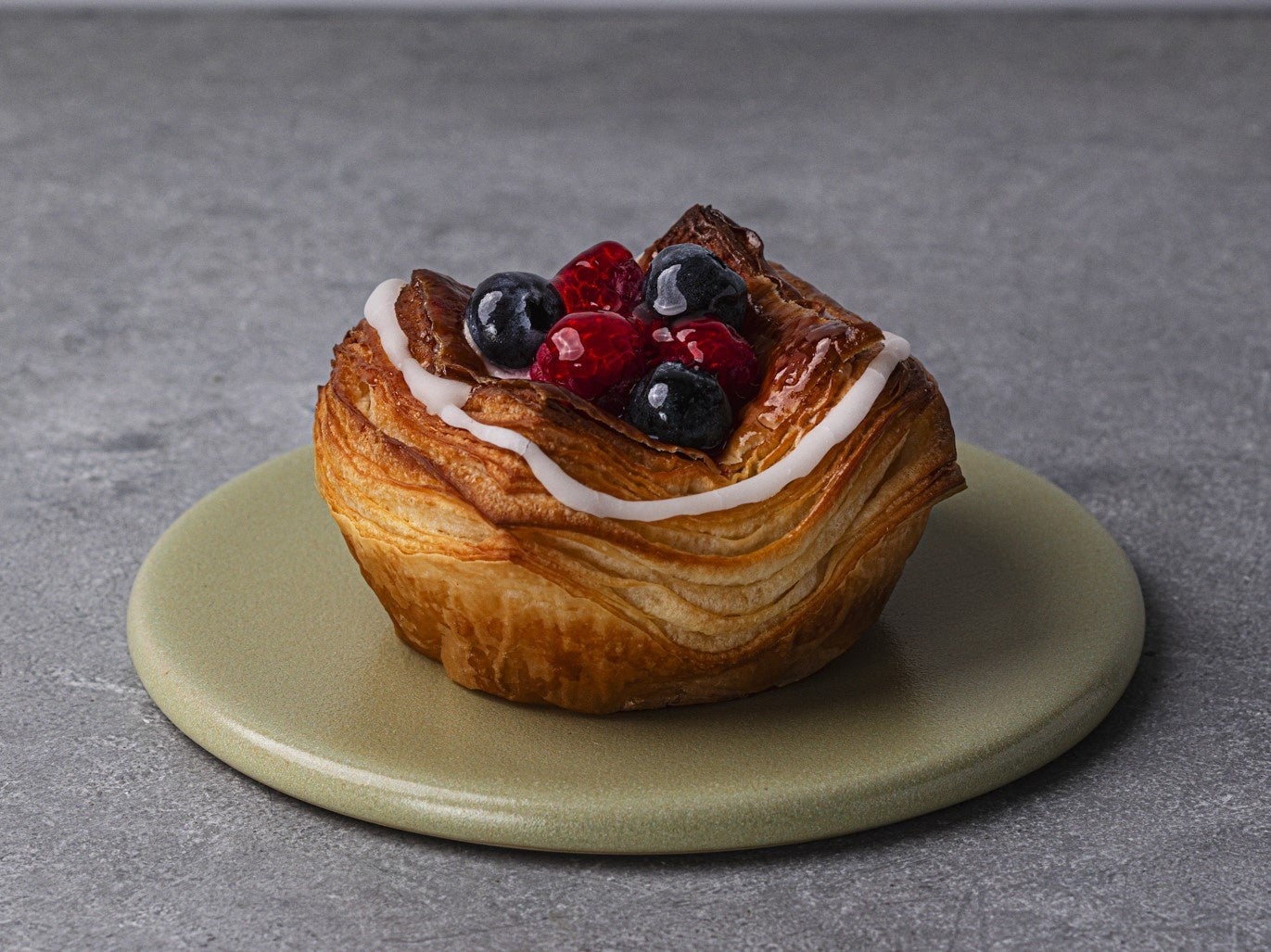 バターが香るサクサクのデニッシュに、ブルーベリーやラズベリーなどのミックスベリーを華やかにトッピング。中に隠れたカスタード&ヨーグルトクリームは甘さ控えめで、爽やかな味わいです。テイクアウトはもちろん、淹れたてのコーヒーとともにイートインで味わうのもおすすめです。※販売時間:10:00~