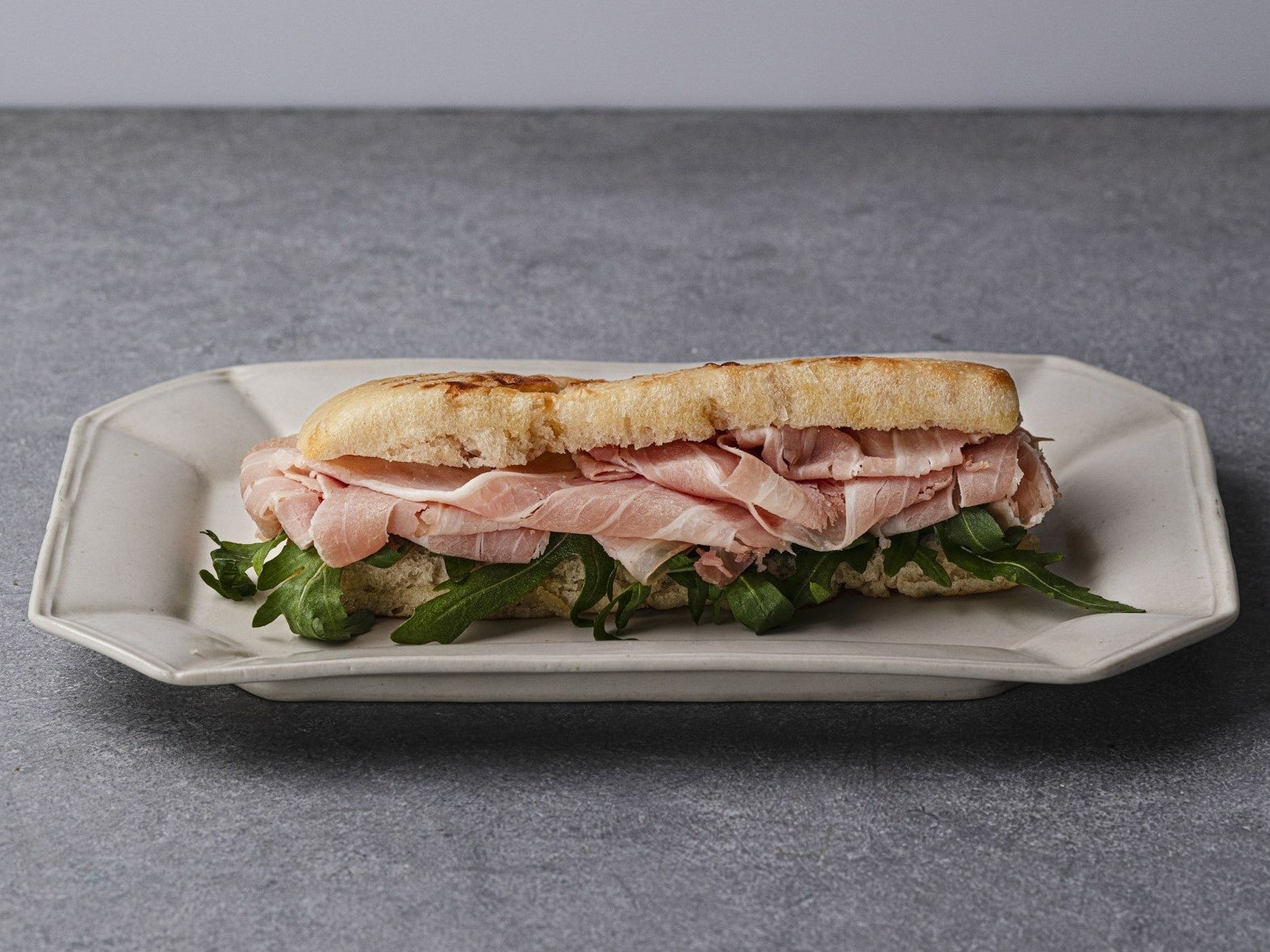 イタリア産小麦粉を使い店内厨房で焼き上げたフォカッチャ生地に、様々な具材を挟んだパニーニ。この春の新作は、イタリア有名ハムメーカーのパンチェッタコッタを使用。豚バラ肉を加熱して作るこのハムは、口に入れた瞬間にとろける脂のおいしさをお楽しみいただけます。添えたルーコラで、さっぱりと相性も抜群です。