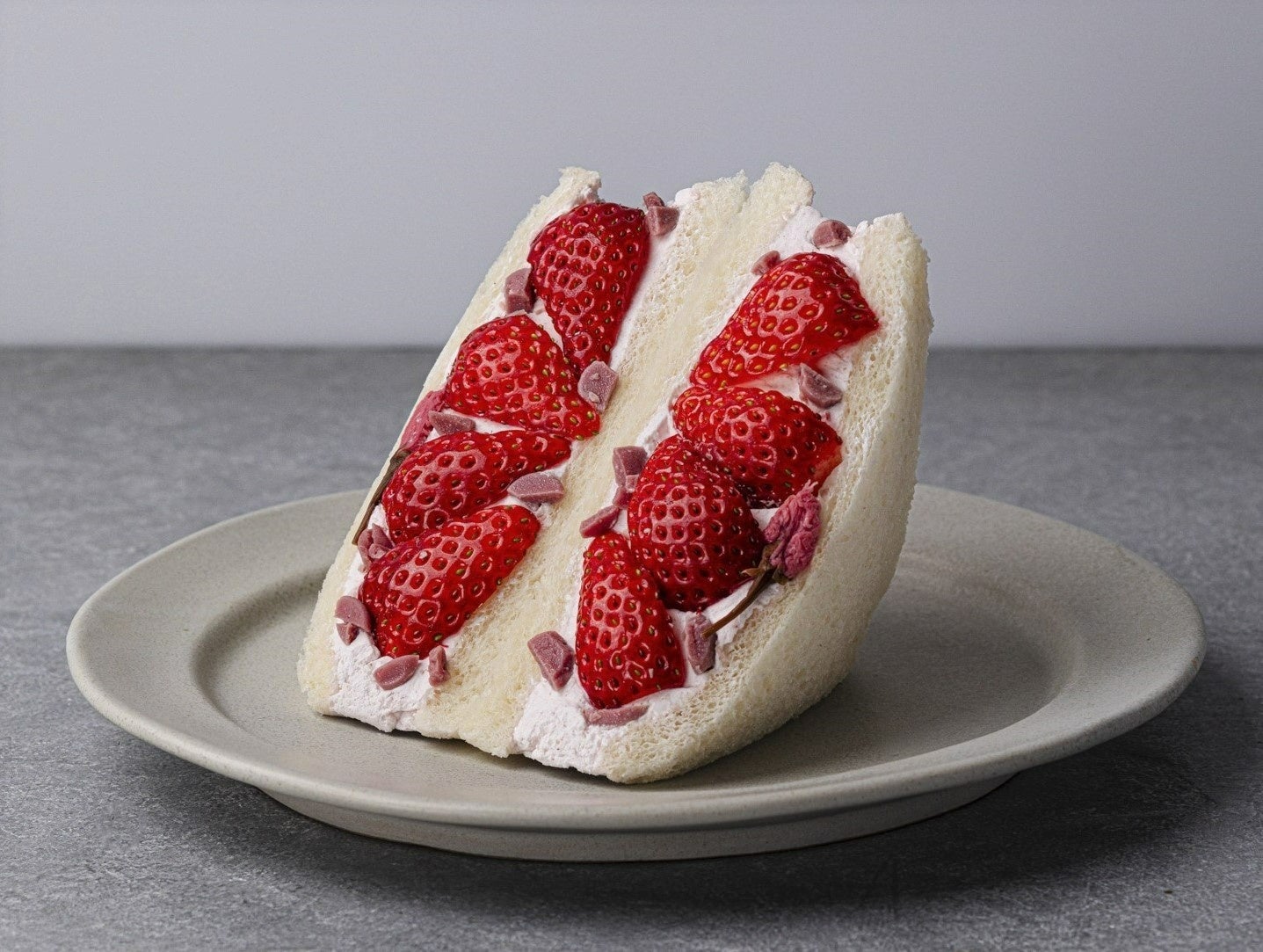 見た目も味も春いっぱいのサンドイッチ!断面と内側に計4個のいちごを使った、華やかなサンドイッチ。クリームもいちご入りで、甘酸っぱく爽やかな味わいです。断面に飾られた桜の花の塩漬け、ルビーチョコが味のアクセントになっています。
