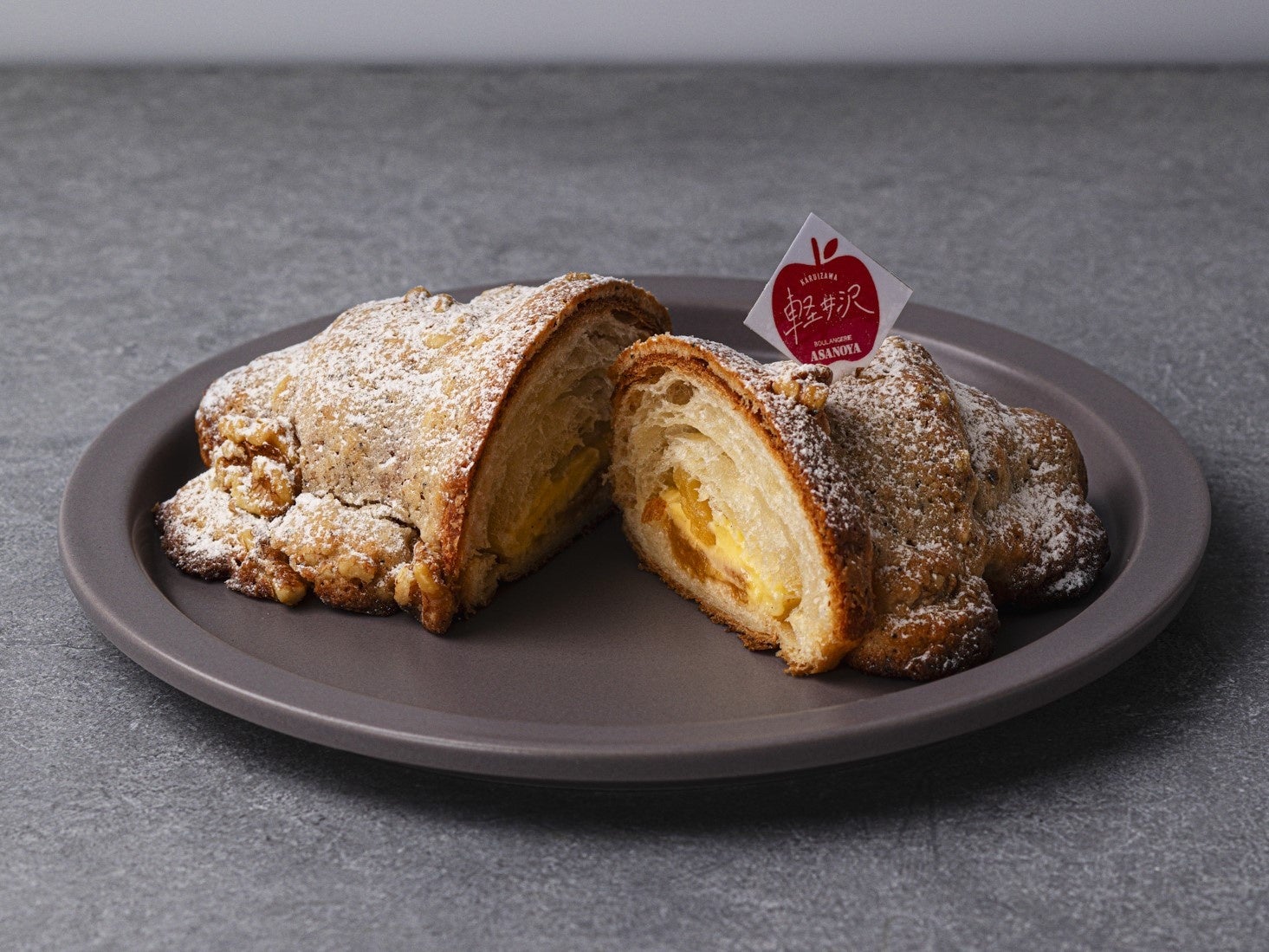 クロワッサンの中に、なめらかなりんごジャム、果肉を残したりんごのプレザーブ、カスタードクリームを挟みました。風味豊かなジャムとシャキシャキ食感の両方のりんごの味わいが楽しめ、表面にはアールグレイ茶葉を加えたダマンドとクルミをトッピングしています。