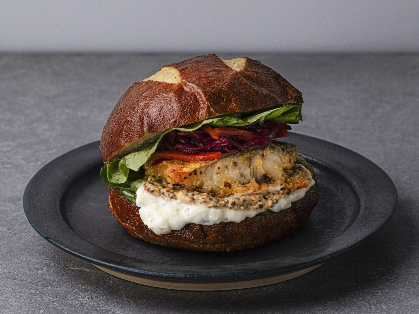 福井県の名物「焼き鯖すし」でお馴染みの若廣が、春のパンフェアに初登場。皮はパリッと中はふっくらの焼き鯖に、香ばしく塩気のあるプレッツェルバンズがベストマッチ。粒マスタードとレモンが香るタルタルソースが鯖のうまみを引き立て、シャキシャキのニンジンマリネも風味が際立ちます。