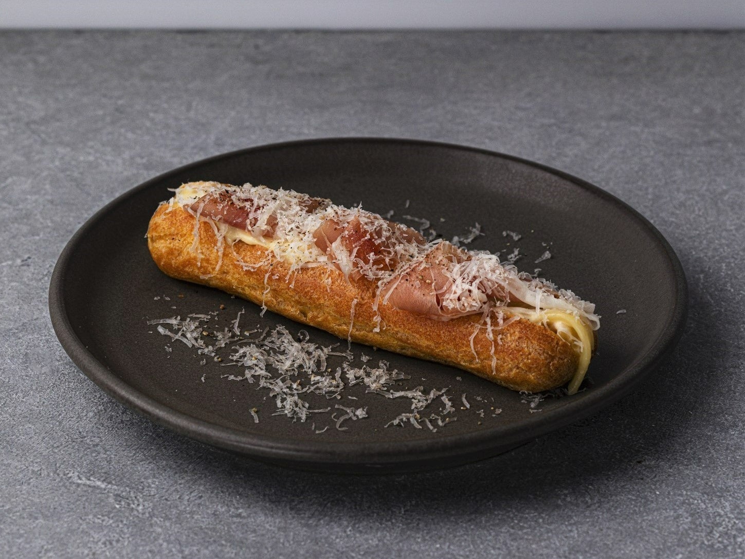 エクレアに、前菜やパスタ、メインディッシュなどを挟んだ人気の「パニーノ」の新作。生ハムとクリームソースをのせ、すりおろしたチーズとブラックペッパーをたっぷりとかけました。“まさにカルボナーラ”な味わいをお楽しみください。