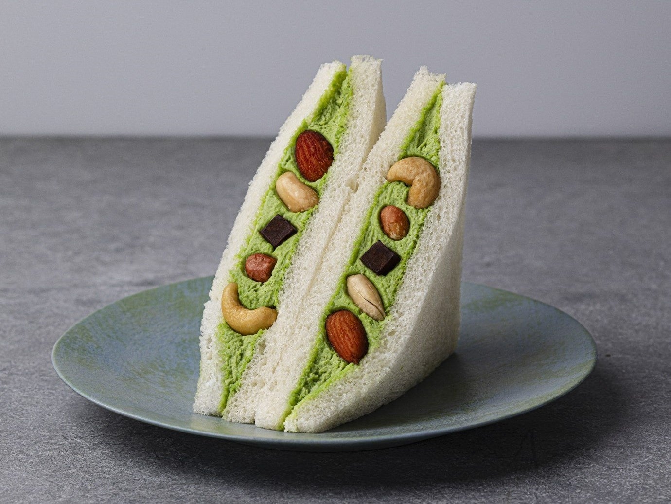 鮮やかな緑のクリームに整列して並ぶナッツ類が、アートのような春サンドです。クリームはピスタチオの風味を活かし甘さ控えめで、アーモンド、カシューナッツ、ピーナッツの香ばしさやカリカリ食感がぴったり。生チョコはリッチな味を演出する名脇役を担っています。